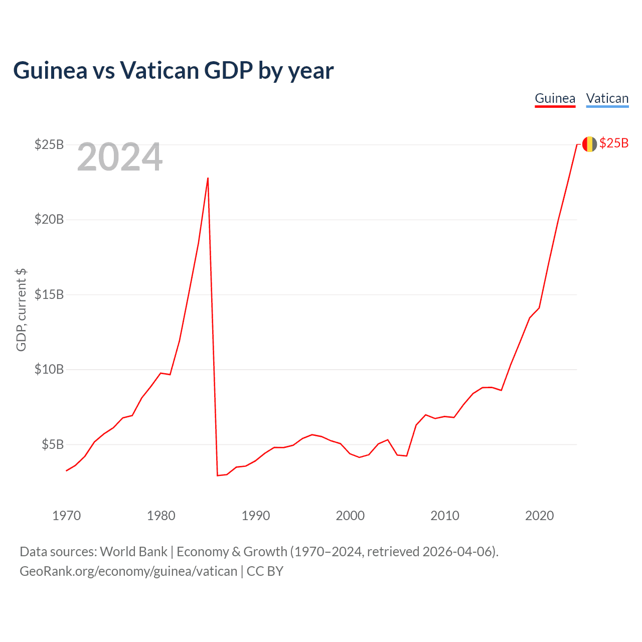 Guinea has a GDP of $25B compared to $19.8M for the Vatican, ranking 118/197 and 197/197 by economy size, respectively.