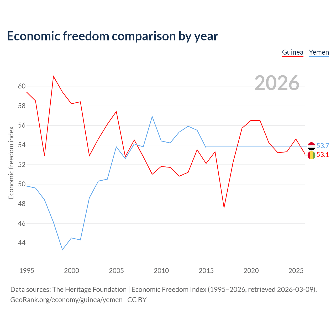 The Economic Freedom Index for Guinea is 53.1, ranking 141/197, compared to 53.7 for Yemen, ranking 138/197. The chart above displays a comparison of annual changes in economic freedom indexes.