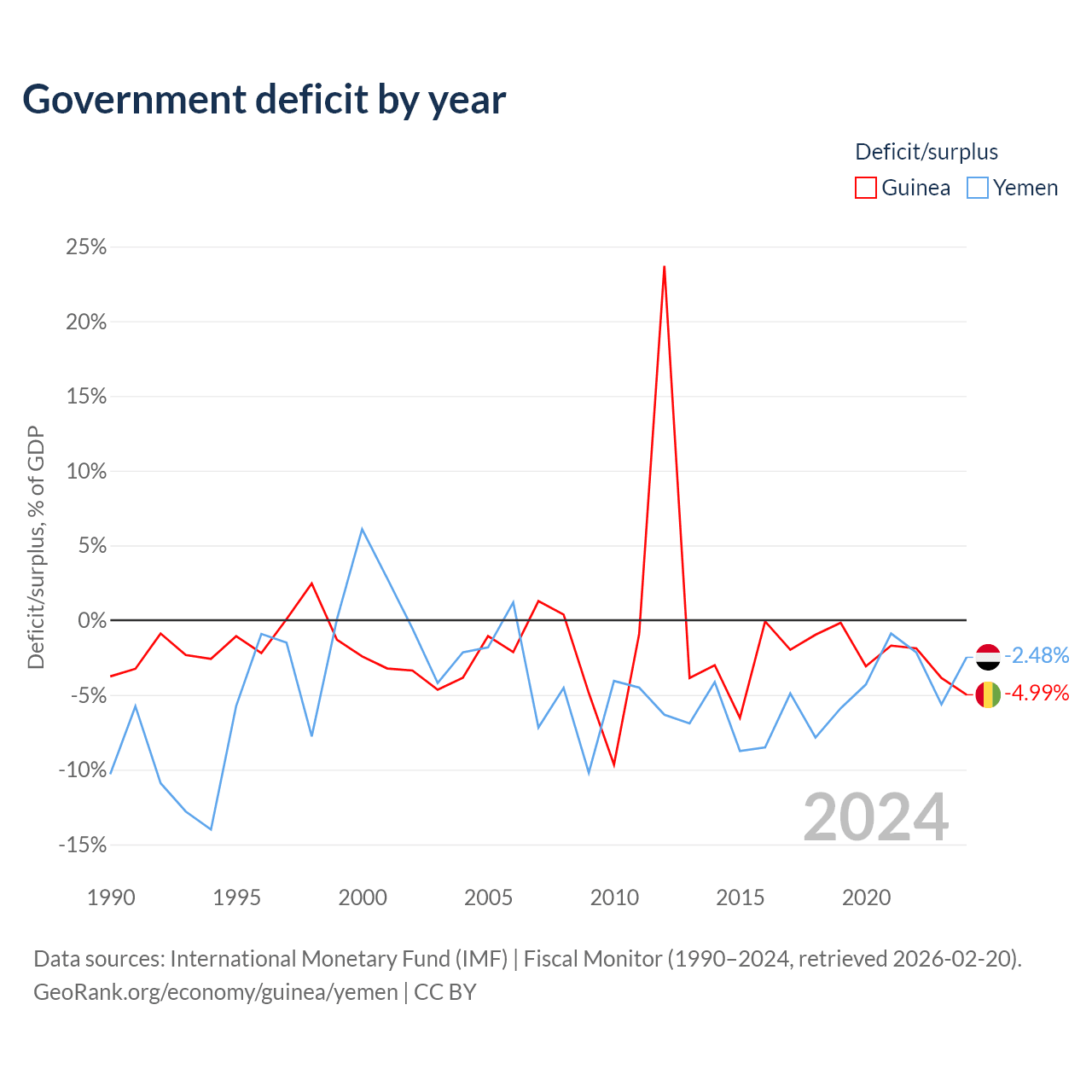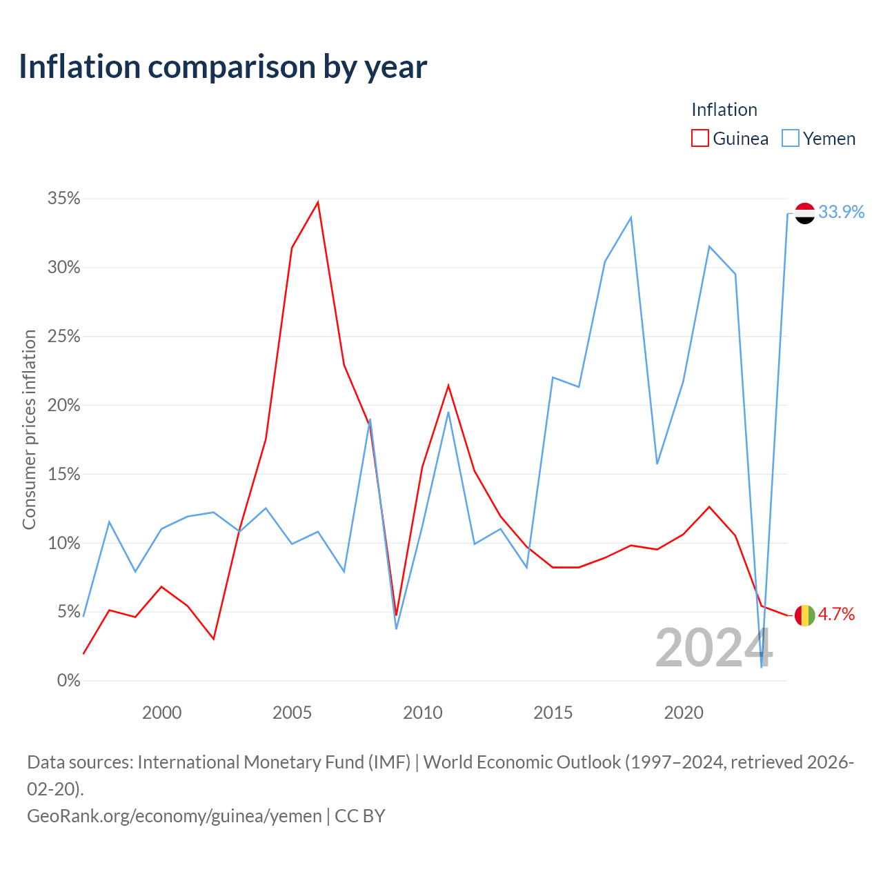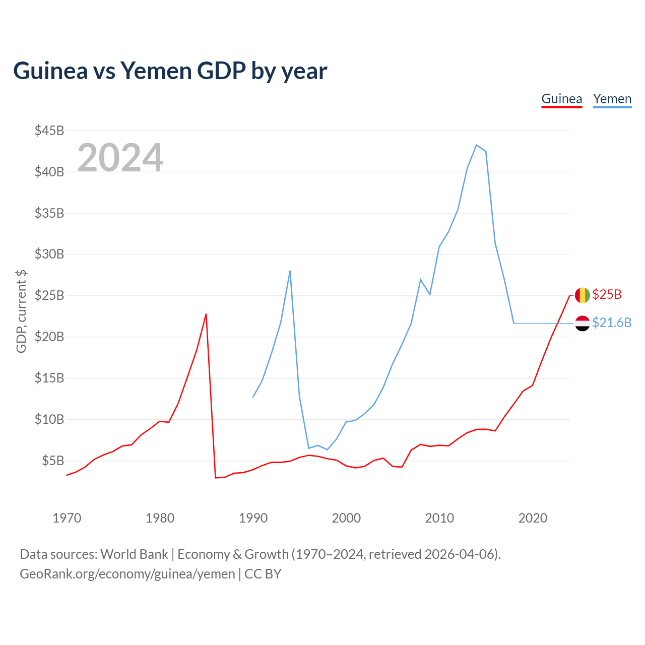 Guinea has a GDP of $25B compared to $21.6B for Yemen, ranking 118/197 and 125/197 by economy size, respectively.