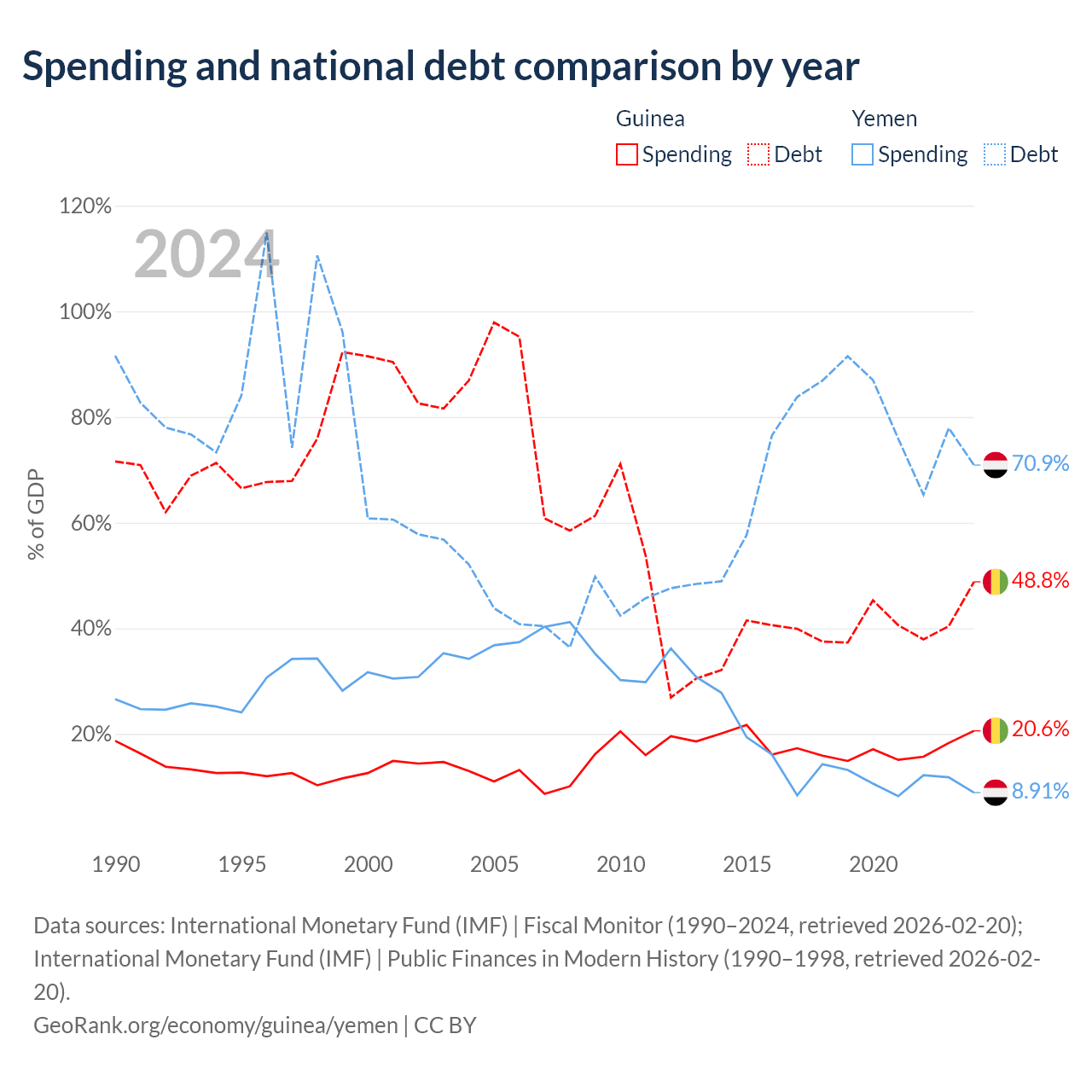Guinea has $12.2B in government debt (48.8% of GDP), compared to $18.8B (70.9% of GDP) in Yemen.
