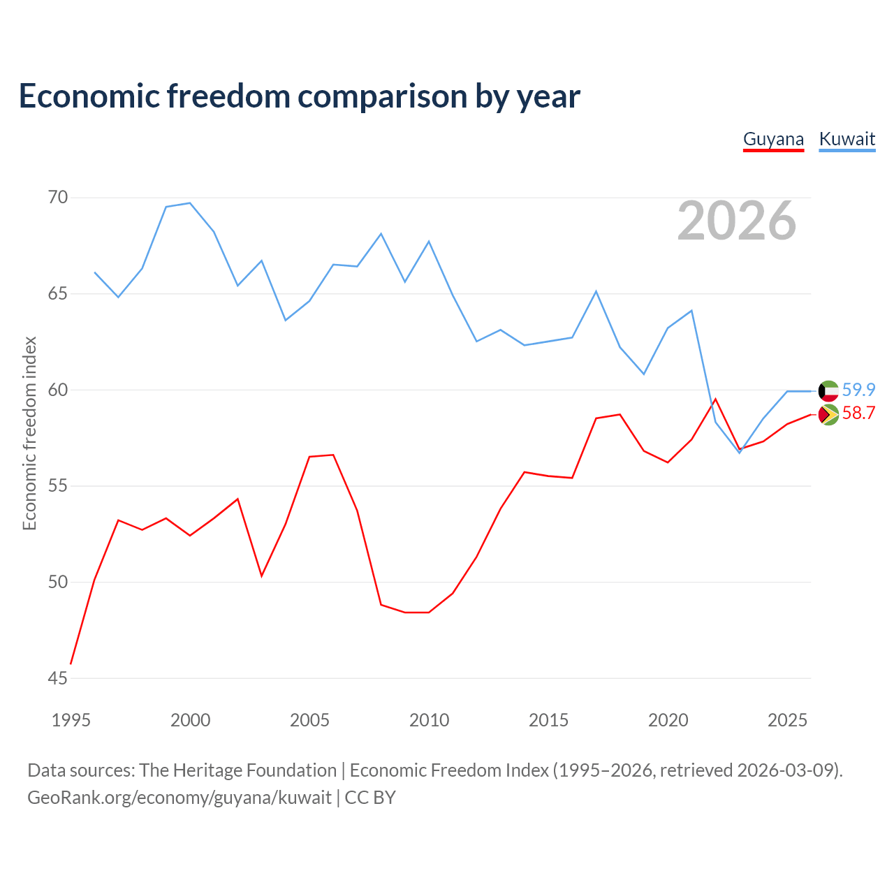 The Economic Freedom Index for Guyana is 58.7, ranking 109/197, compared to 59.9 for Kuwait, ranking 100/197. The chart above displays a comparison of annual changes in economic freedom indexes.