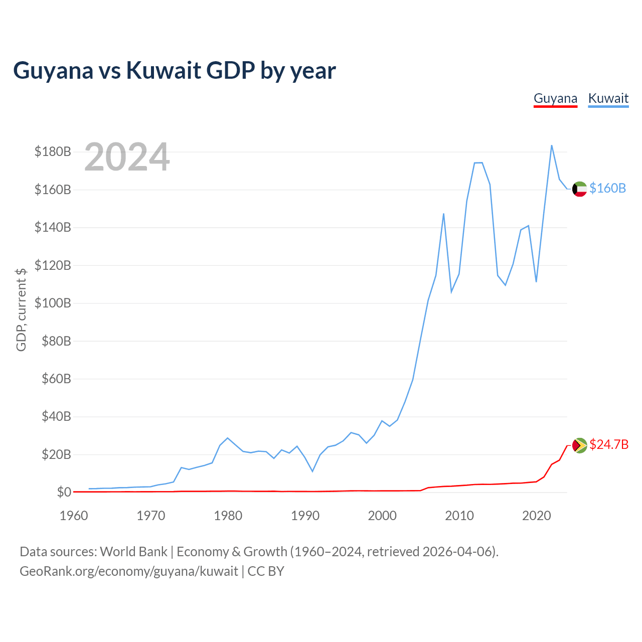 Guyana has a GDP of $24.7B compared to $160B for Kuwait, ranking 120/197 and 59/197 by economy size, respectively.