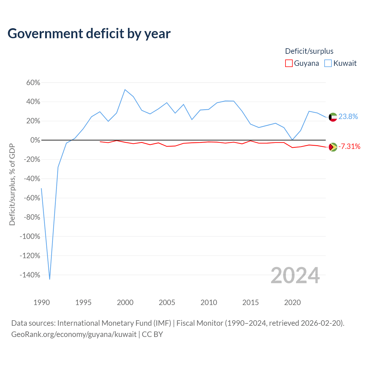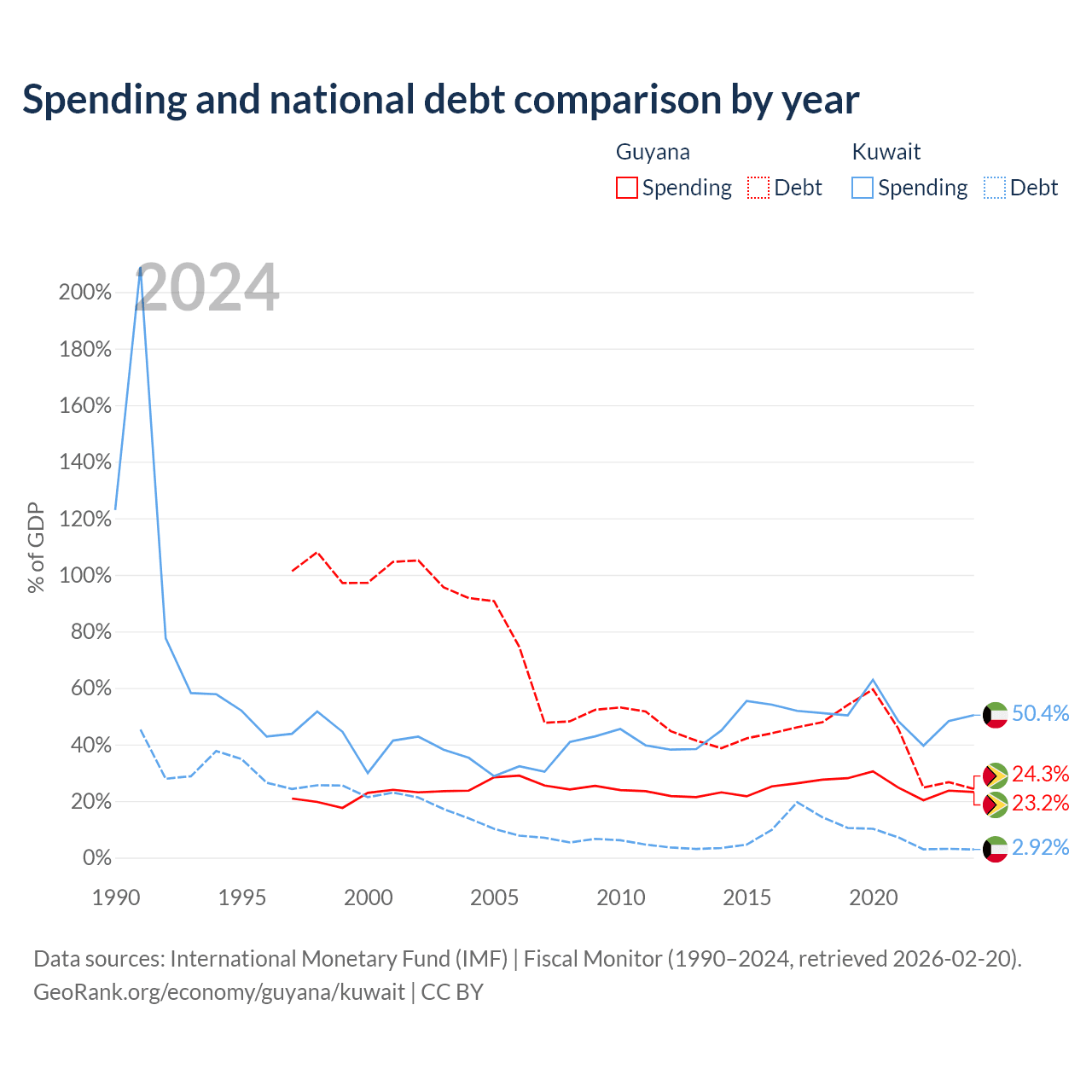 Guyana has $5.99B in government debt (24.3% of GDP), compared to $4.68B (2.92% of GDP) in Kuwait.