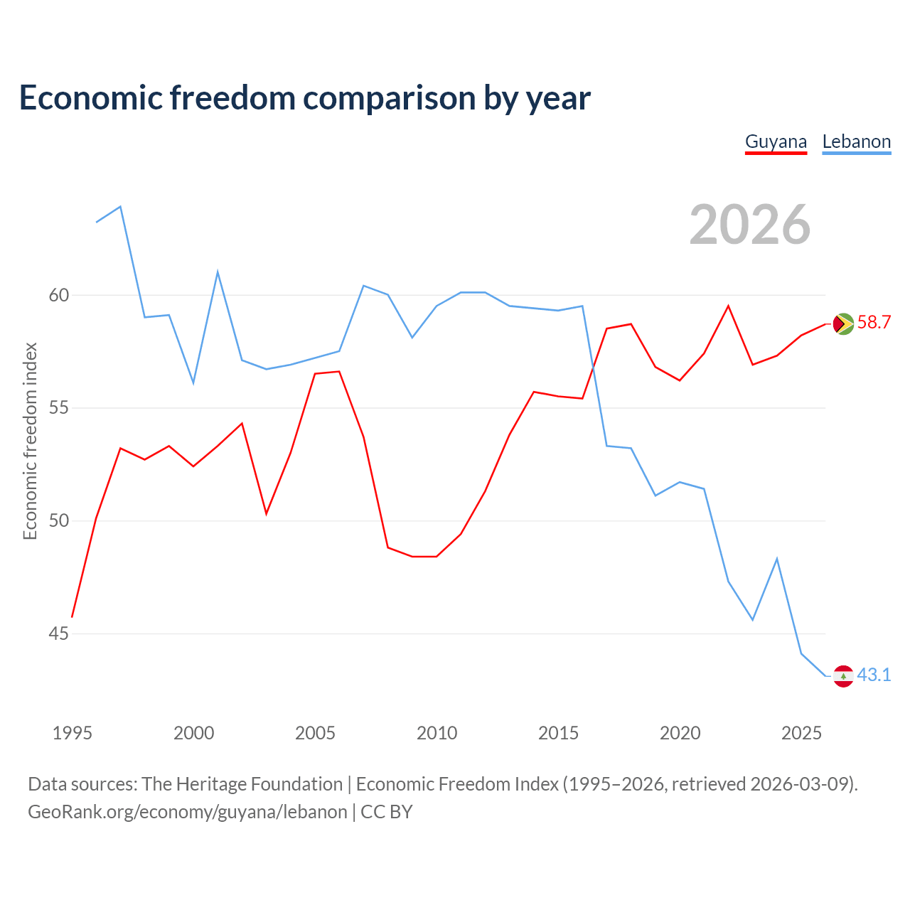 The Economic Freedom Index for Guyana is 58.7, ranking 109/197, compared to 43.1 for Lebanon, ranking 183/197. The chart above displays a comparison of annual changes in economic freedom indexes.