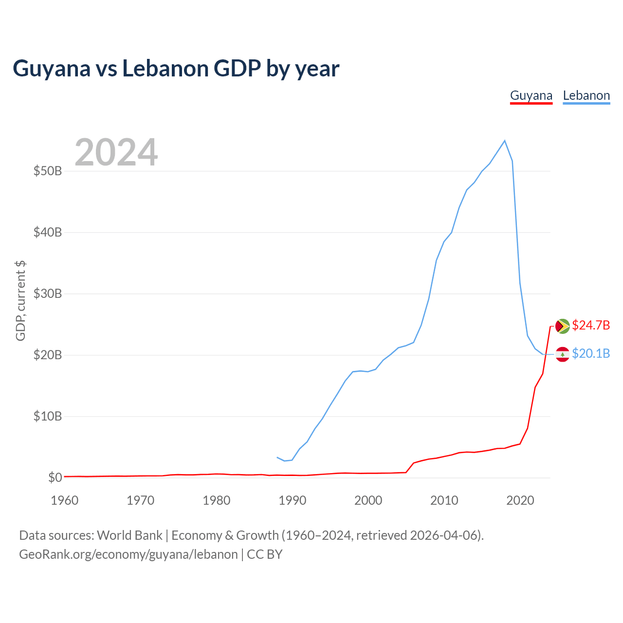 Guyana has a GDP of $24.7B compared to $20.1B for Lebanon, ranking 120/197 and 128/197 by economy size, respectively.