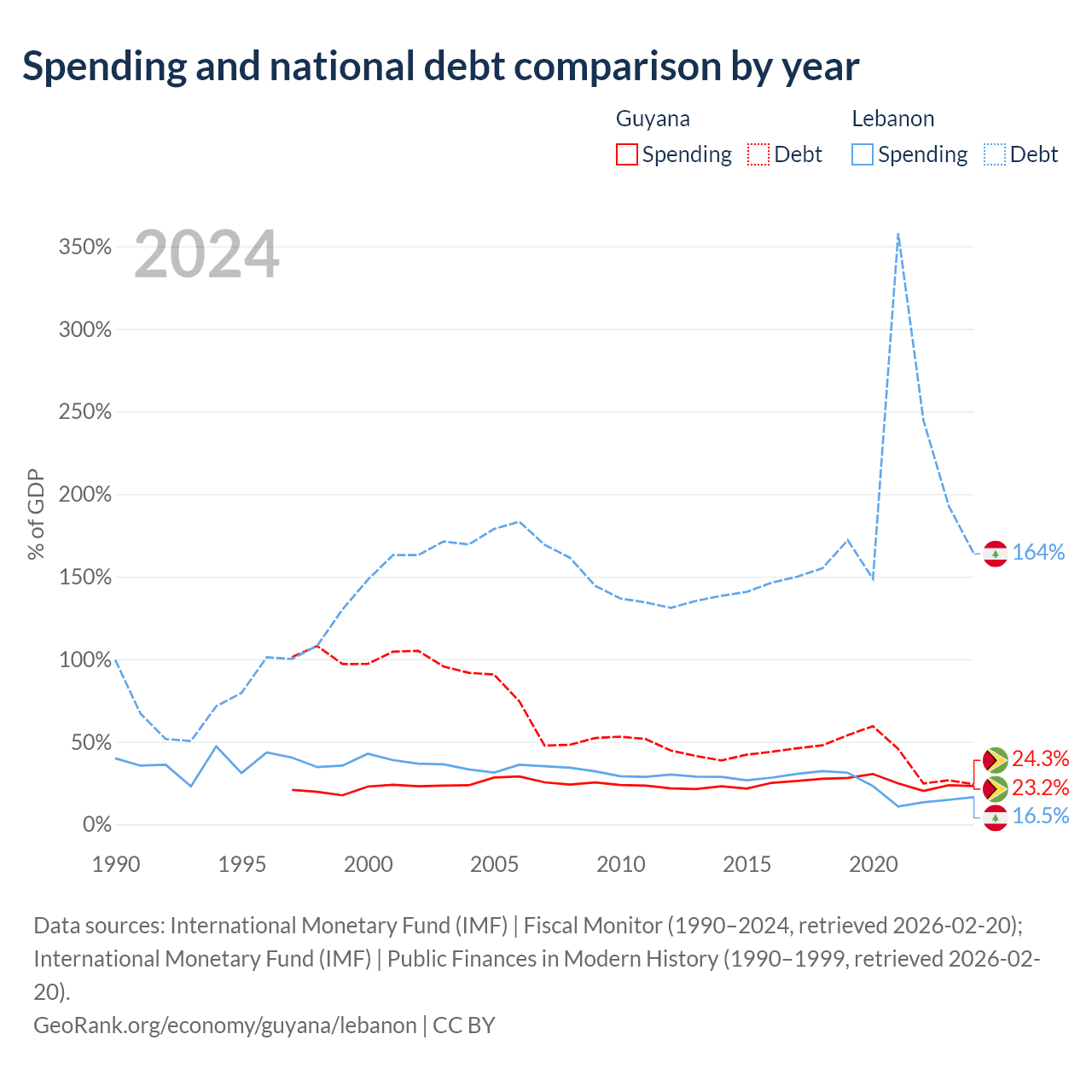 Guyana has $5.99B in government debt (24.3% of GDP), compared to $38.7B (163.8% of GDP) in Lebanon.