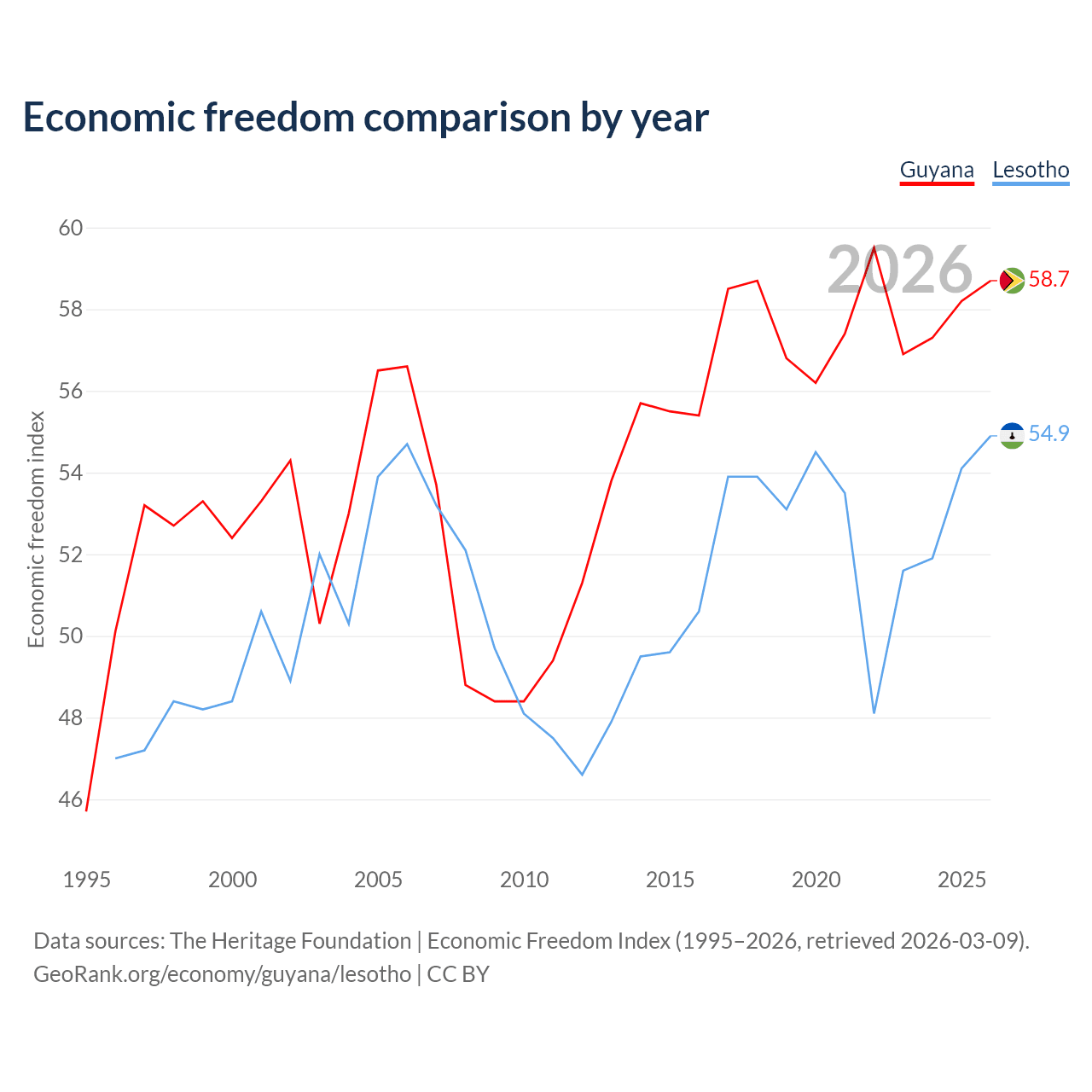 The Economic Freedom Index for Guyana is 58.7, ranking 109/197, compared to 54.9 for Lesotho, ranking 130/197. The chart above displays a comparison of annual changes in economic freedom indexes.