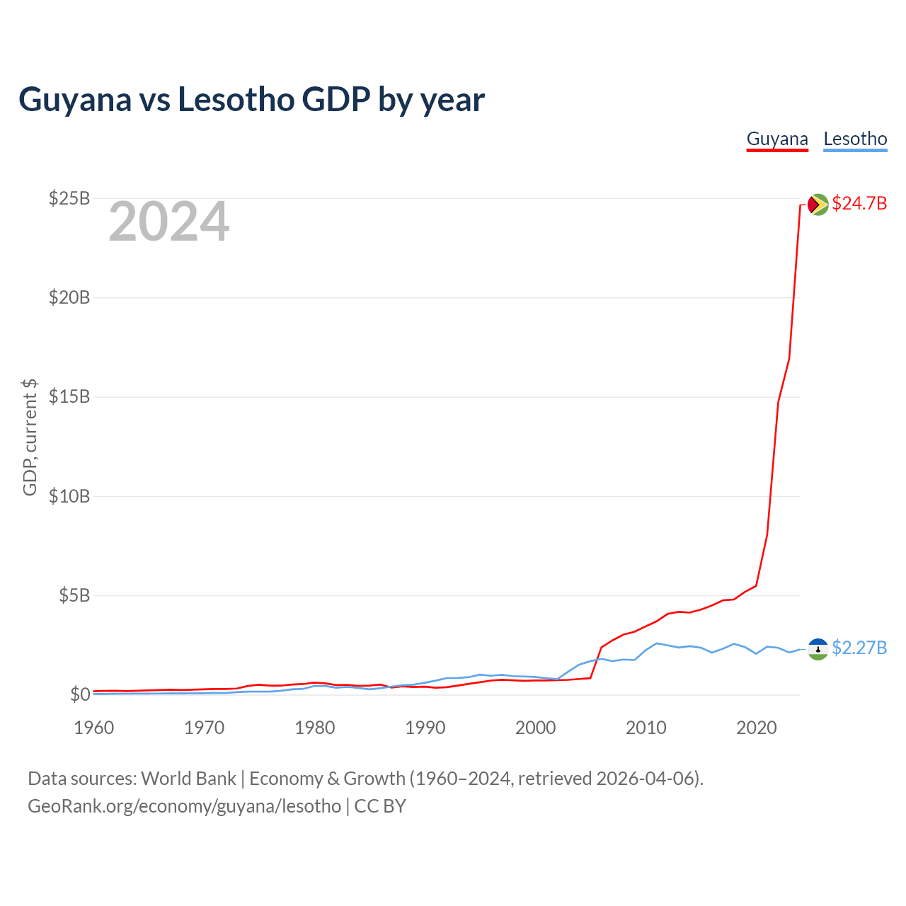 Guyana has a GDP of $24.7B compared to $2.27B for Lesotho, ranking 120/197 and 175/197 by economy size, respectively.