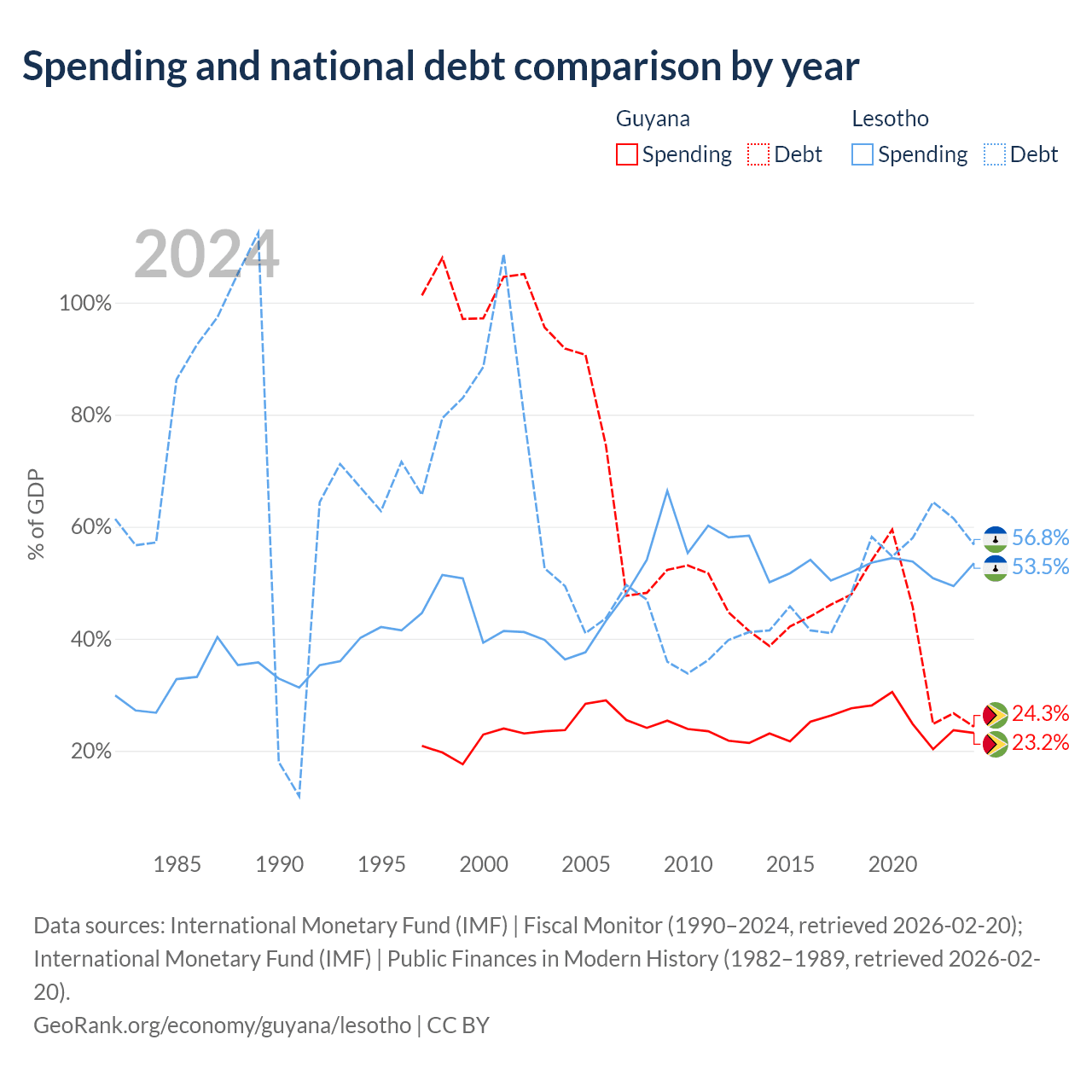 Guyana has $5.99B in government debt (24.3% of GDP), compared to $1.29B (56.8% of GDP) in Lesotho.