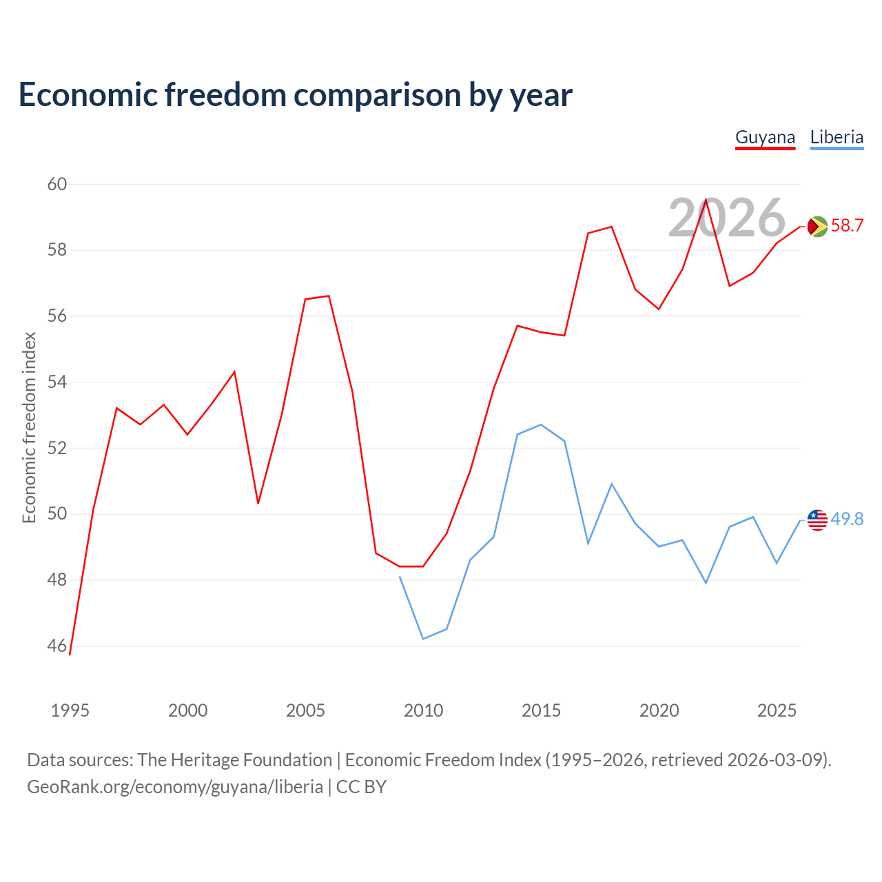 The Economic Freedom Index for Guyana is 58.7, ranking 109/197, compared to 49.8 for Liberia, ranking 163/197. The chart above displays a comparison of annual changes in economic freedom indexes.