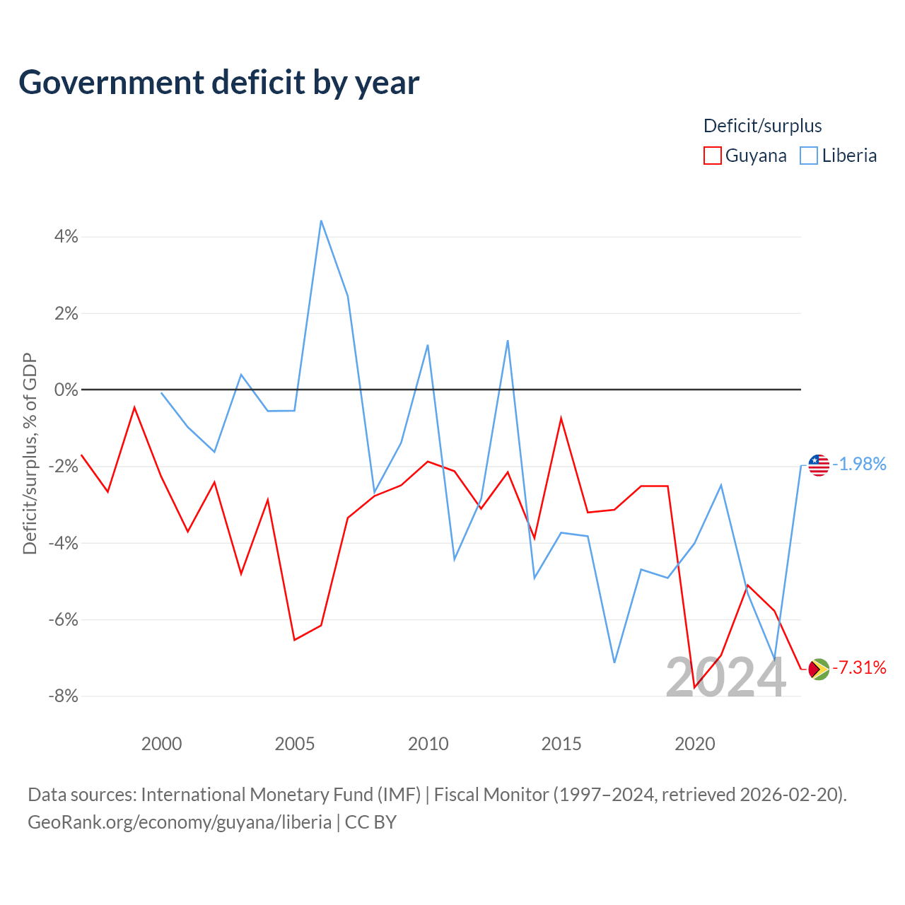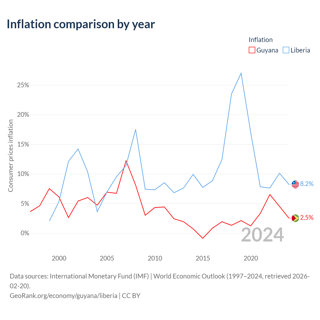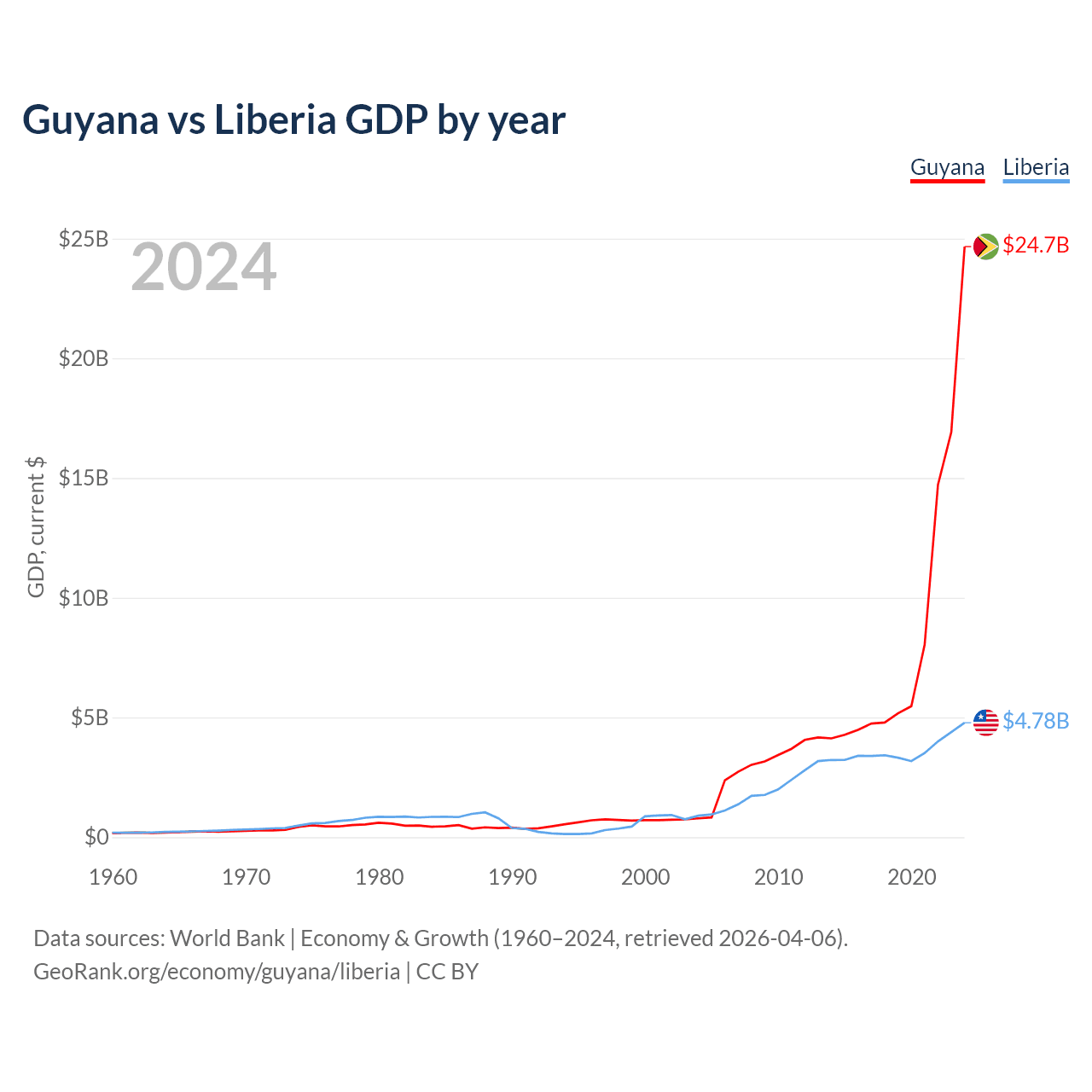 Guyana has a GDP of $24.7B compared to $4.78B for Liberia, ranking 120/197 and 163/197 by economy size, respectively.