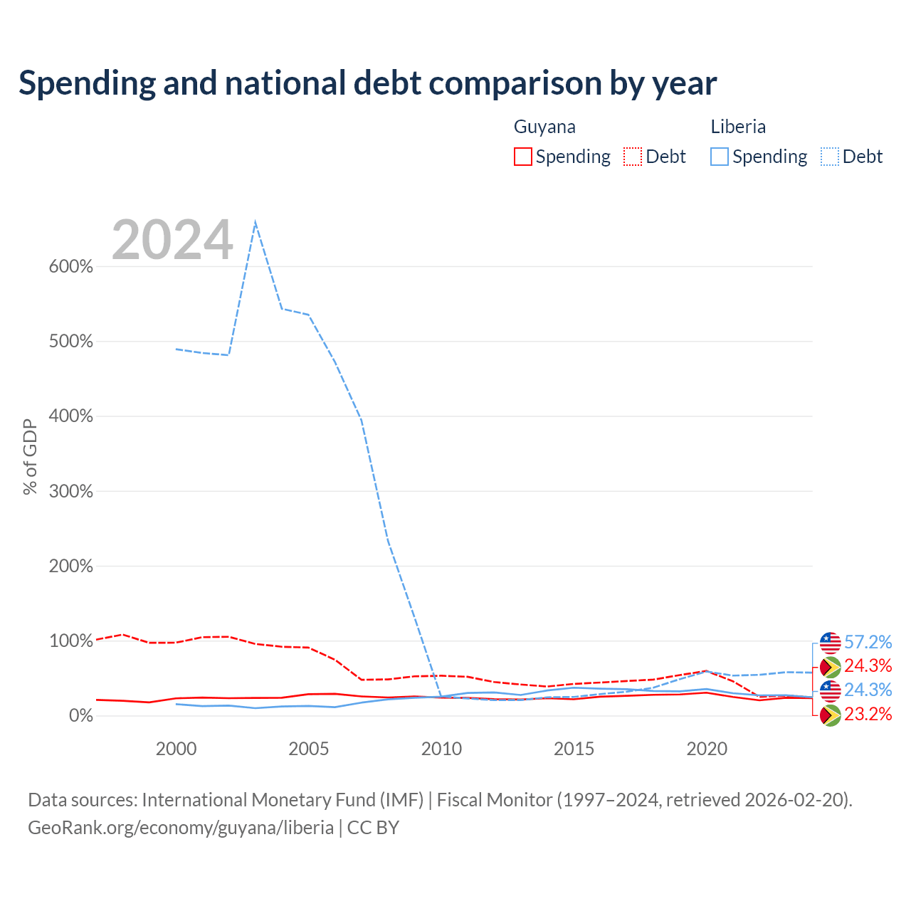 Guyana has $5.99B in government debt (24.3% of GDP), compared to $2.73B (57.2% of GDP) in Liberia.