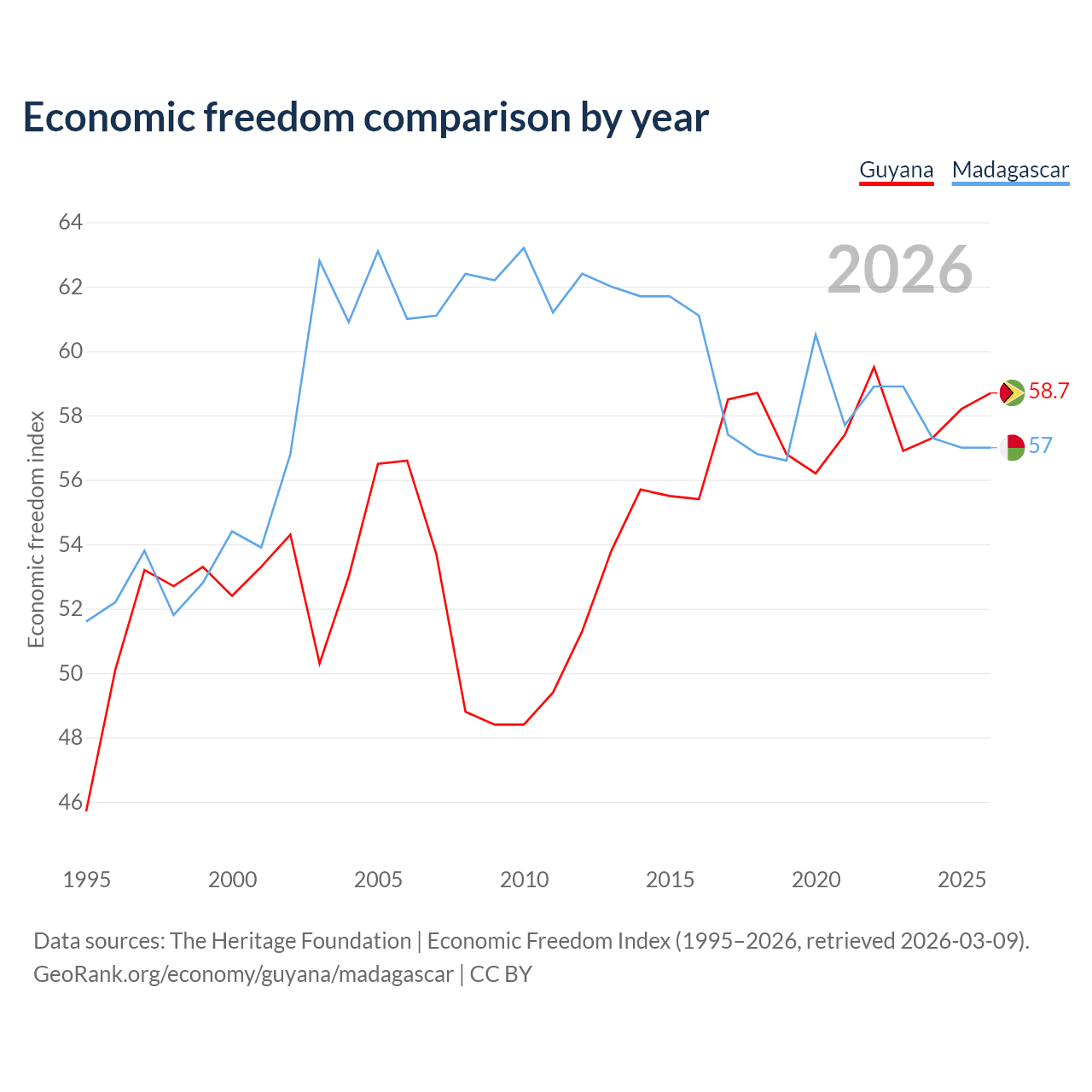 The Economic Freedom Index for Guyana is 58.7, ranking 109/197, compared to 57 for Madagascar, ranking 119/197. The chart above displays a comparison of annual changes in economic freedom indexes.