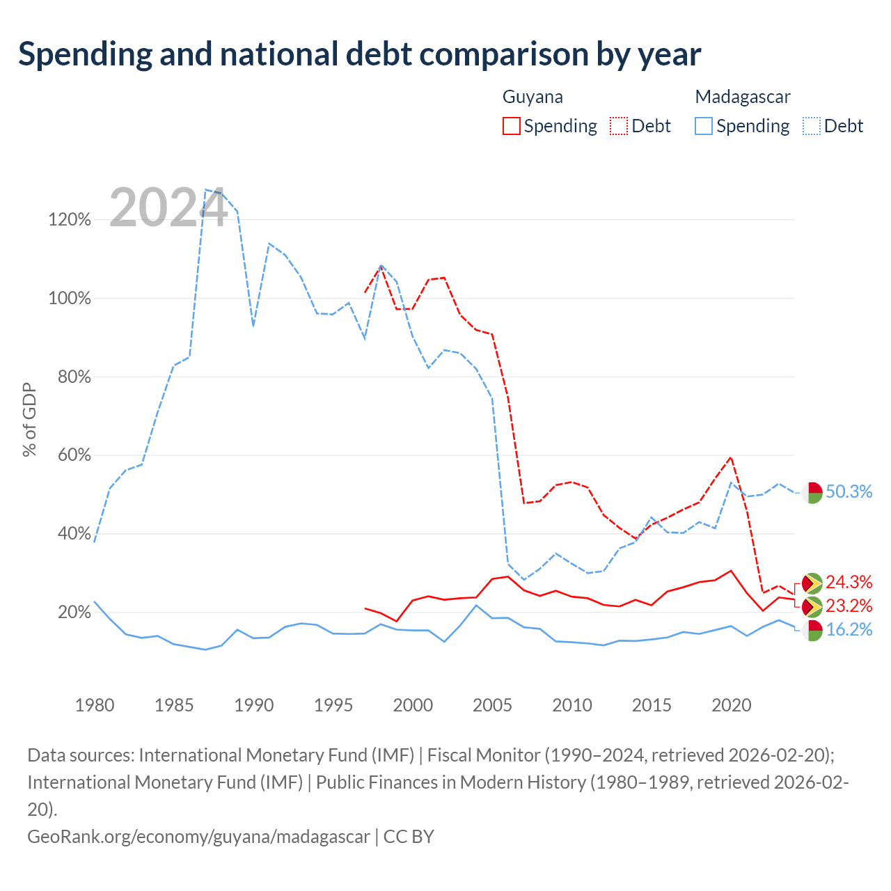 Guyana has $5.99B in government debt (24.3% of GDP), compared to $8.77B (50.3% of GDP) in Madagascar.