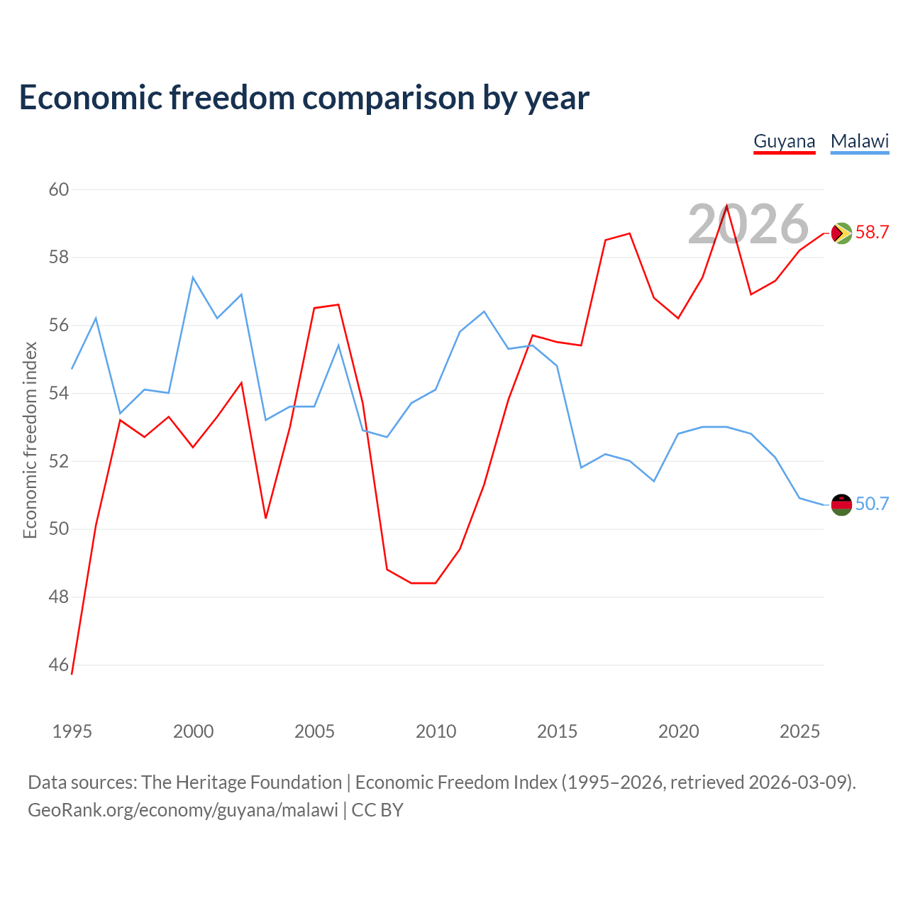 The Economic Freedom Index for Guyana is 58.7, ranking 109/197, compared to 50.7 for Malawi, ranking 159/197. The chart above displays a comparison of annual changes in economic freedom indexes.