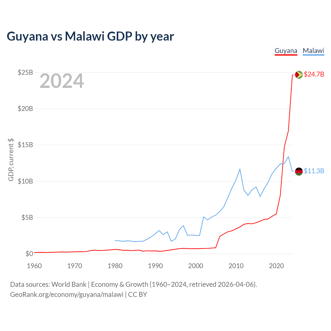 Guyana has a GDP of $24.7B compared to $11.3B for Malawi, ranking 120/197 and 151/197 by economy size, respectively.