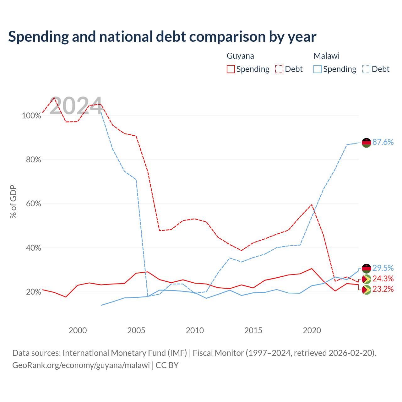Guyana has $5.99B in government debt (24.3% of GDP), compared to $9.91B (87.6% of GDP) in Malawi.