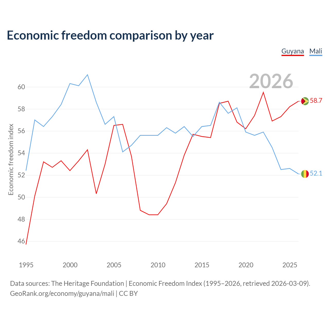 The Economic Freedom Index for Guyana is 58.7, ranking 109/197, compared to 52.1 for Mali, ranking 150/197. The chart above displays a comparison of annual changes in economic freedom indexes.