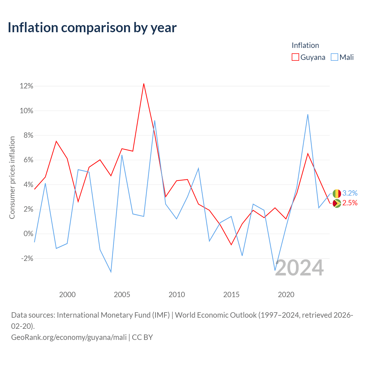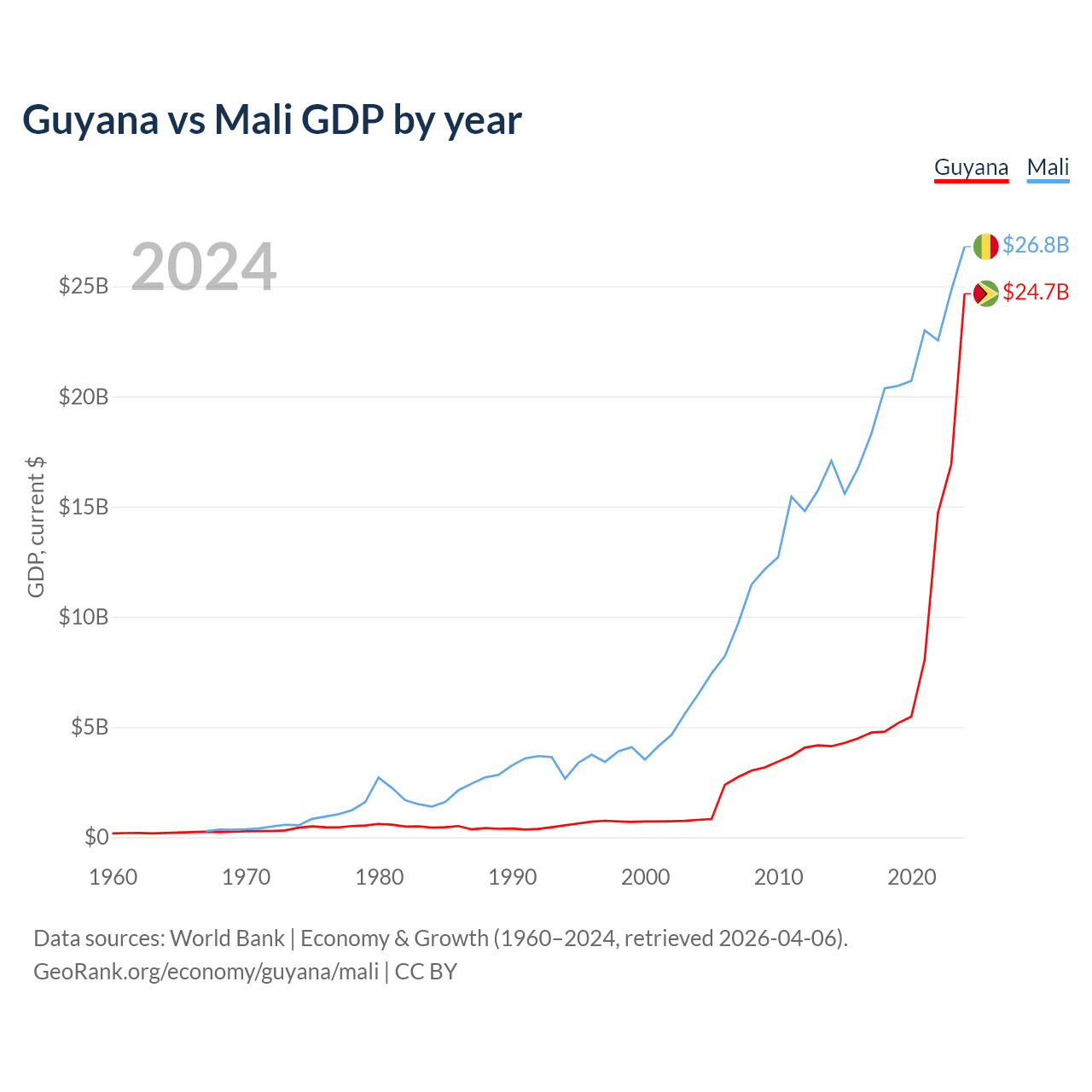 Guyana has a GDP of $24.7B compared to $26.8B for Mali, ranking 120/197 and 113/197 by economy size, respectively.