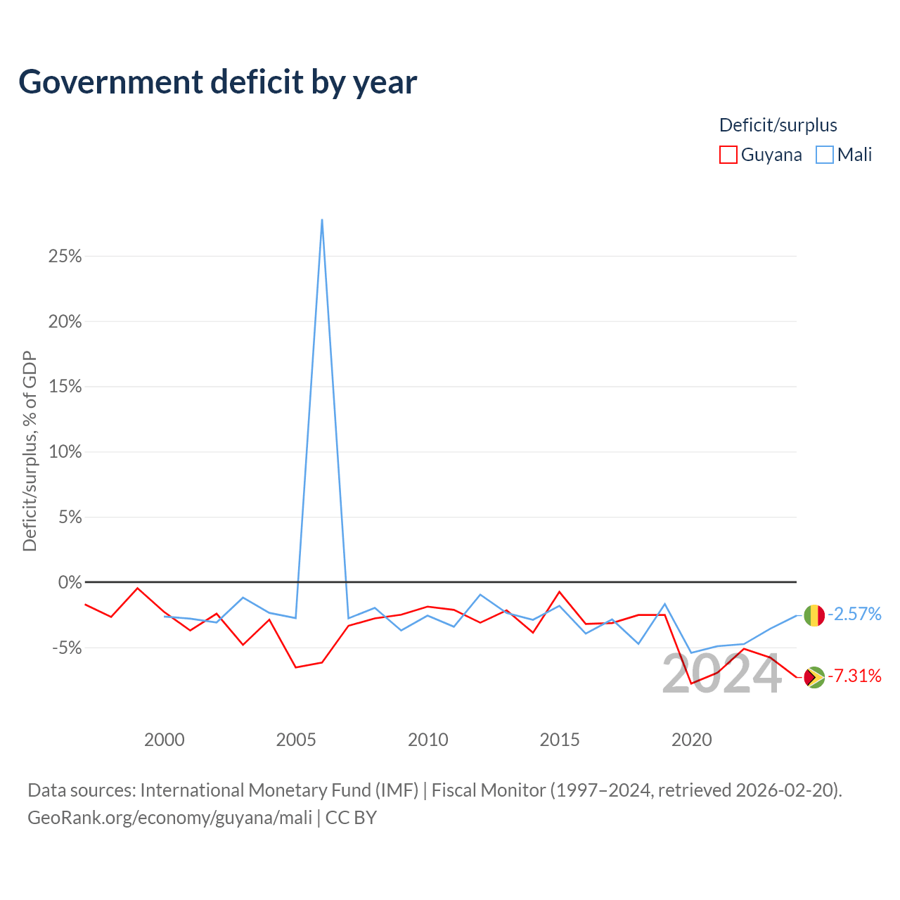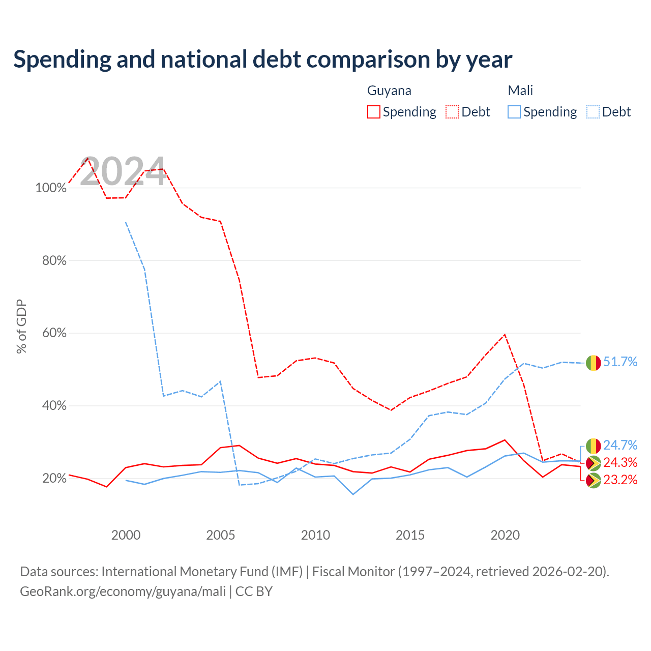 Guyana has $5.99B in government debt (24.3% of GDP), compared to $13.9B (51.7% of GDP) in Mali.