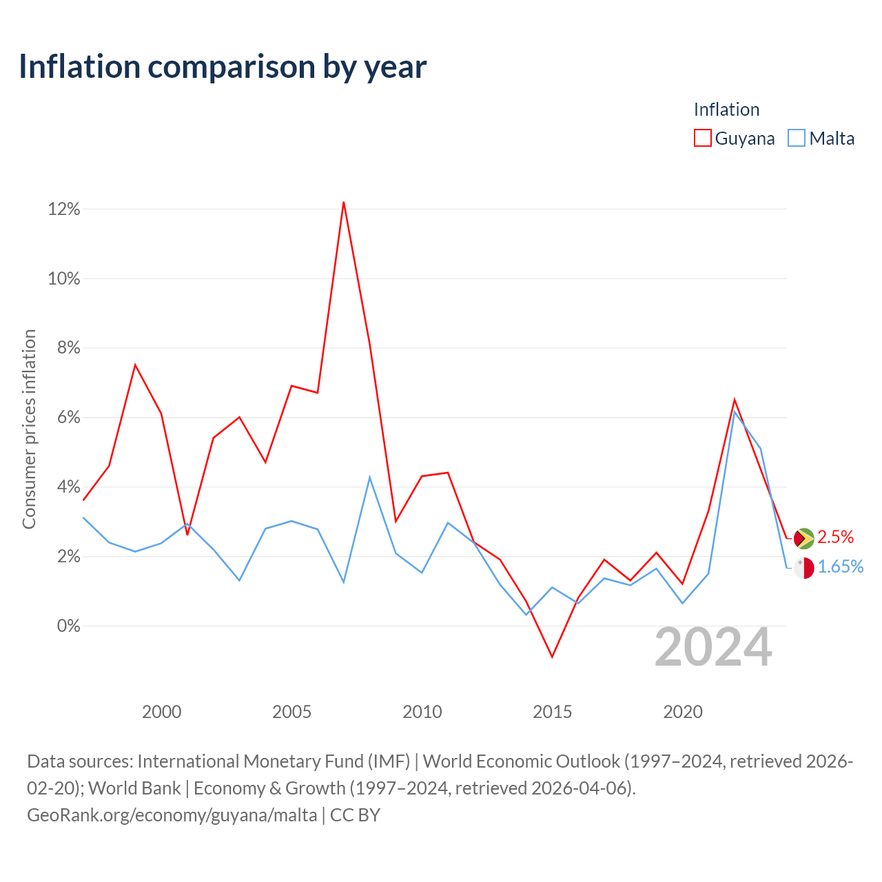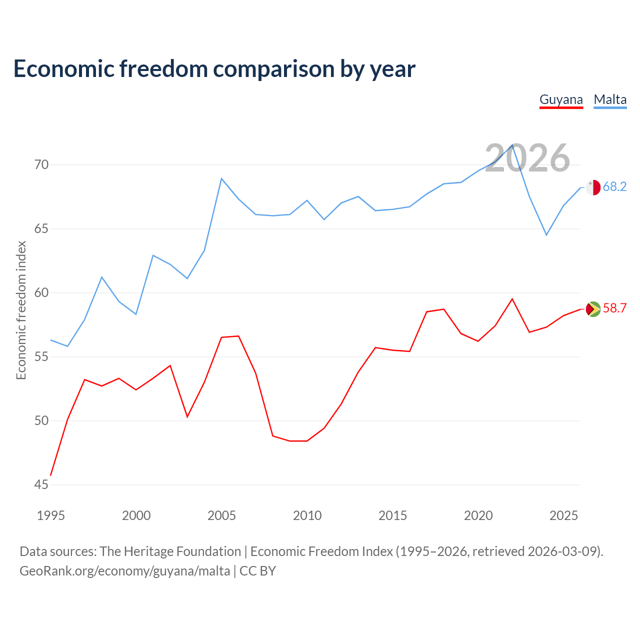 The Economic Freedom Index for Guyana is 58.7, ranking 109/197, compared to 68.2 for Malta, ranking 49/197. The chart above displays a comparison of annual changes in economic freedom indexes.