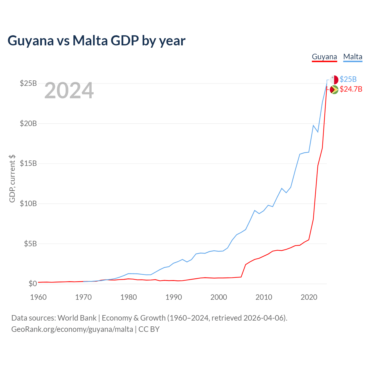 Guyana has a GDP of $24.7B compared to $25B for Malta, ranking 120/197 and 119/197 by economy size, respectively.