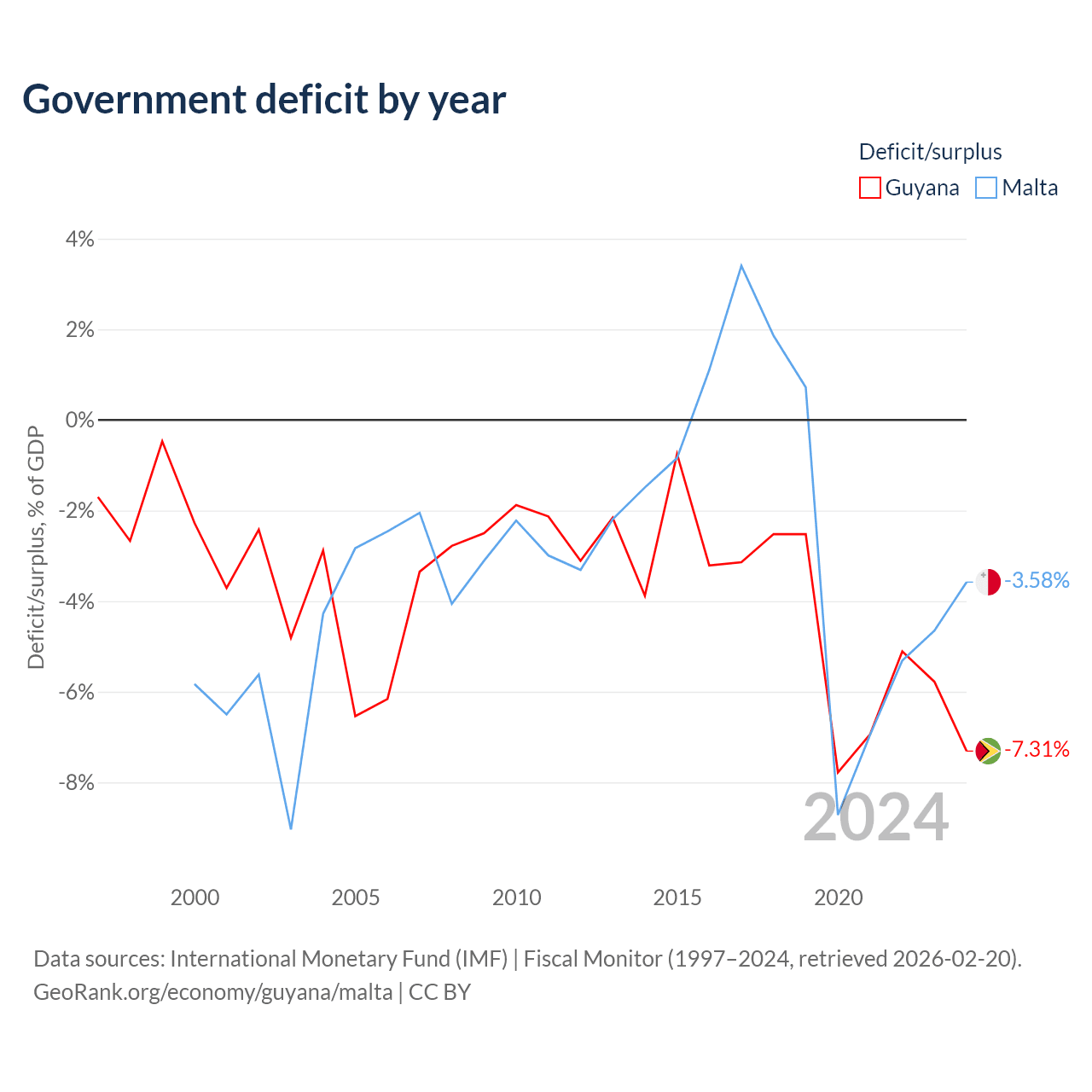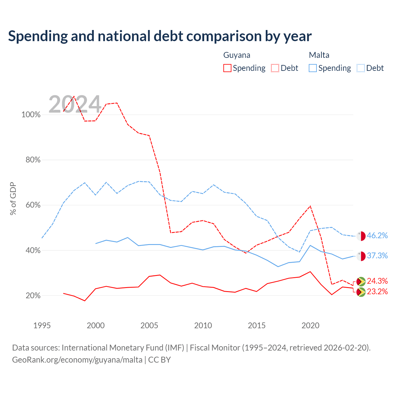 Guyana has $5.99B in government debt (24.3% of GDP), compared to $11.5B (46.2% of GDP) in Malta.