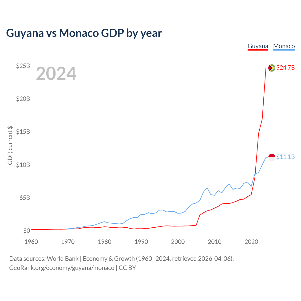 Guyana has a GDP of $24.7B compared to $11.1B for Monaco, ranking 120/197 and 152/197 by economy size, respectively.
