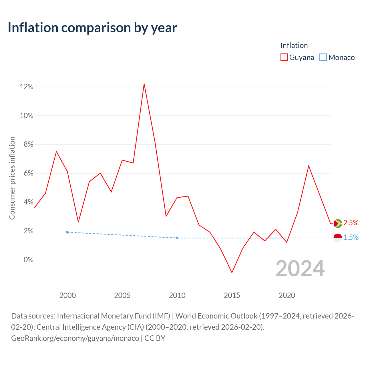 Over the past 21 years, Guyana has recorded an average annual inflation rate of 3.9%, compared with 1.58% in Monaco. In 2020, inflation was 2.5% in Guyana and 1.5% in Monaco.