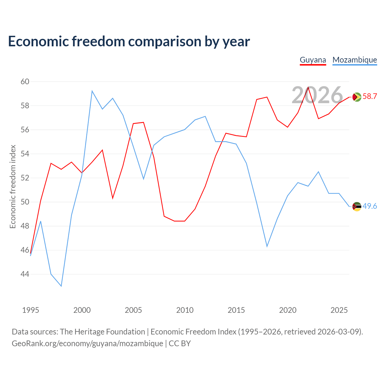 The Economic Freedom Index for Guyana is 58.7, ranking 109/197, compared to 49.6 for Mozambique, ranking 164/197. The chart above displays a comparison of annual changes in economic freedom indexes.