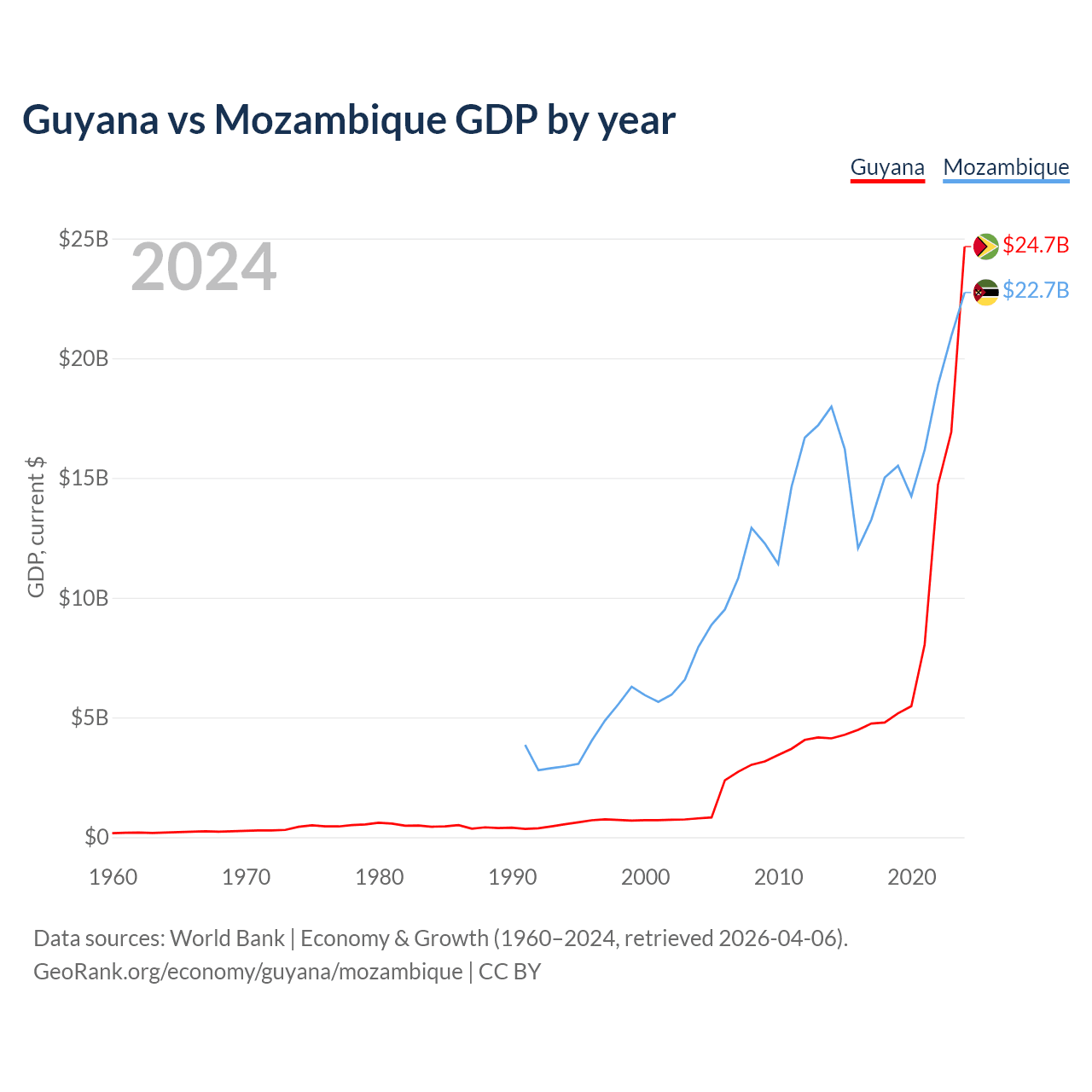 Guyana has a GDP of $24.7B compared to $22.7B for Mozambique, ranking 120/197 and 123/197 by economy size, respectively.
