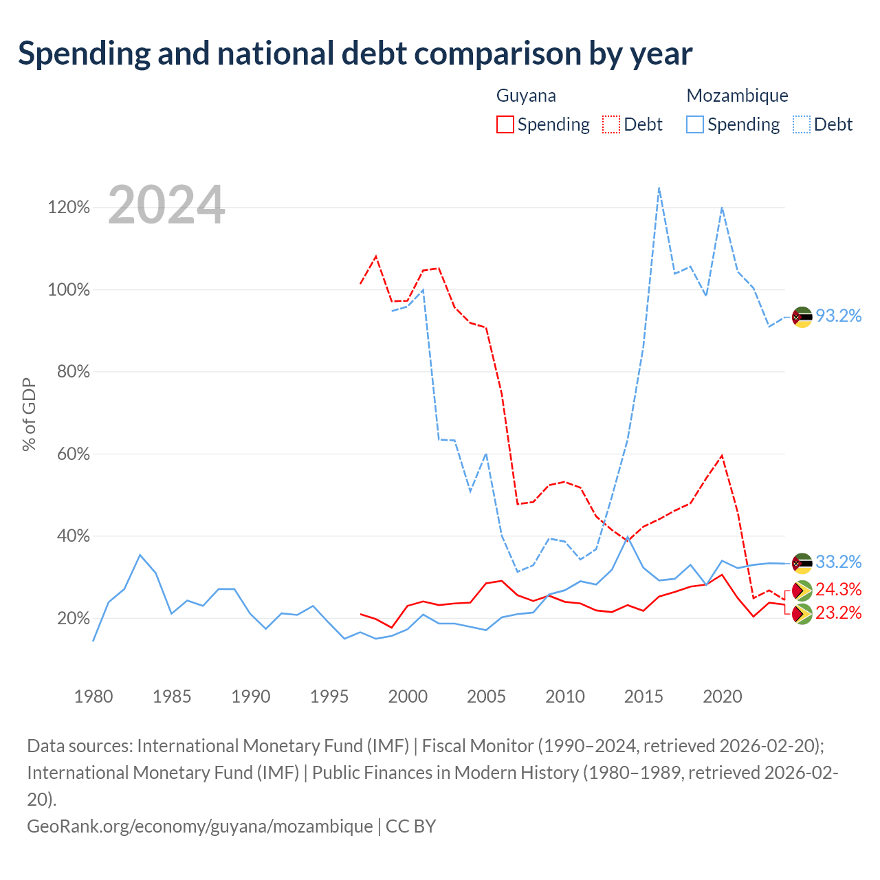 Guyana has $5.99B in government debt (24.3% of GDP), compared to $21.2B (93.2% of GDP) in Mozambique.