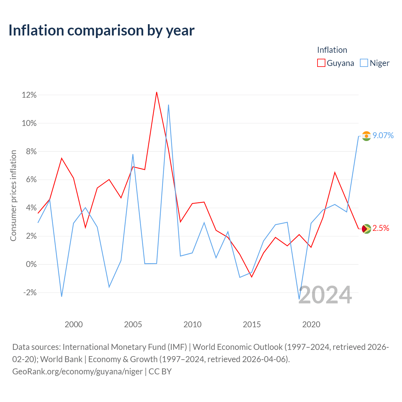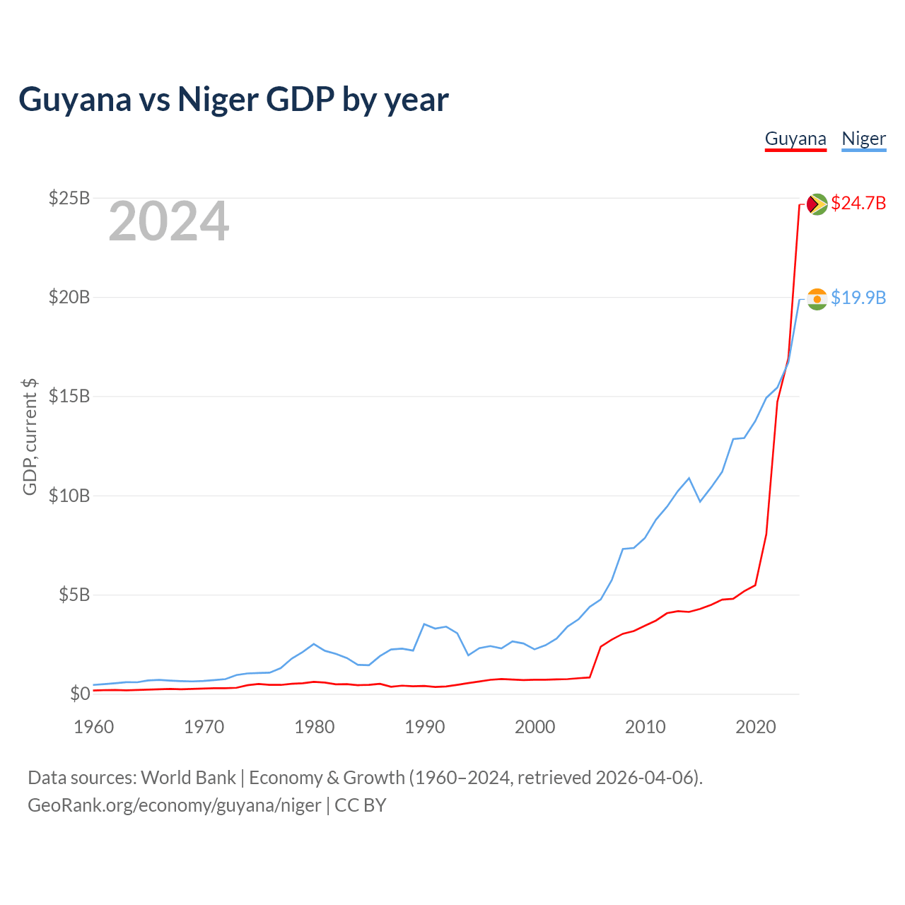 Guyana has a GDP of $24.7B compared to $19.9B for Niger, ranking 120/197 and 130/197 by economy size, respectively.