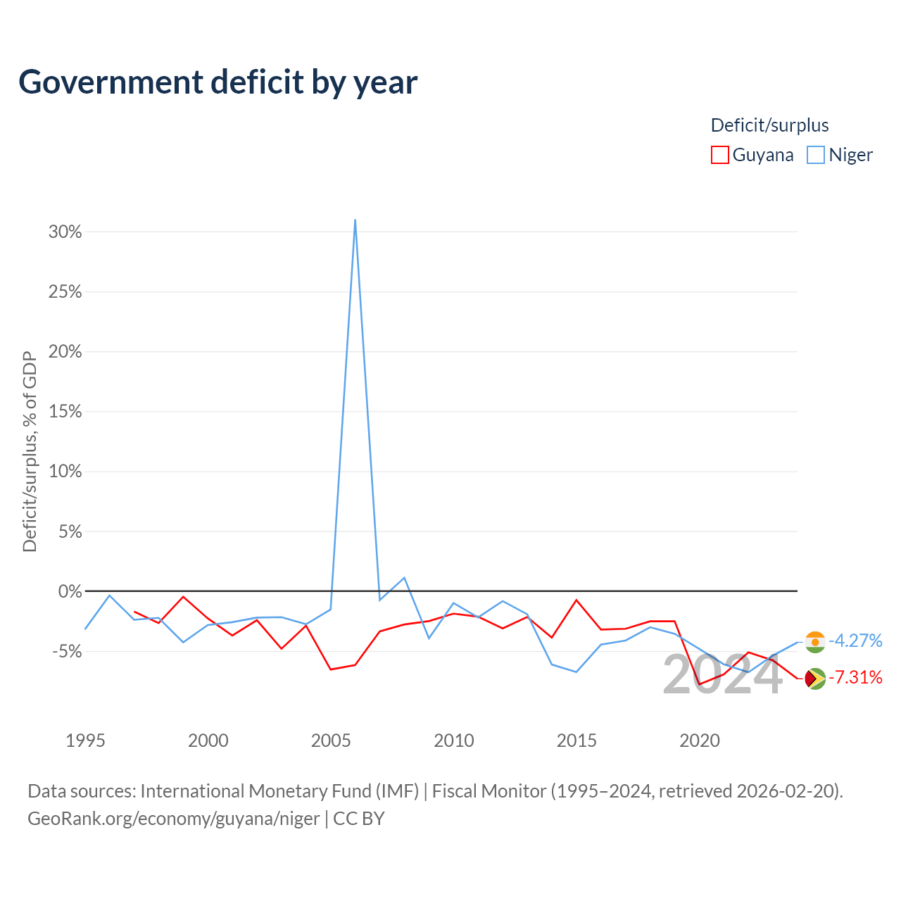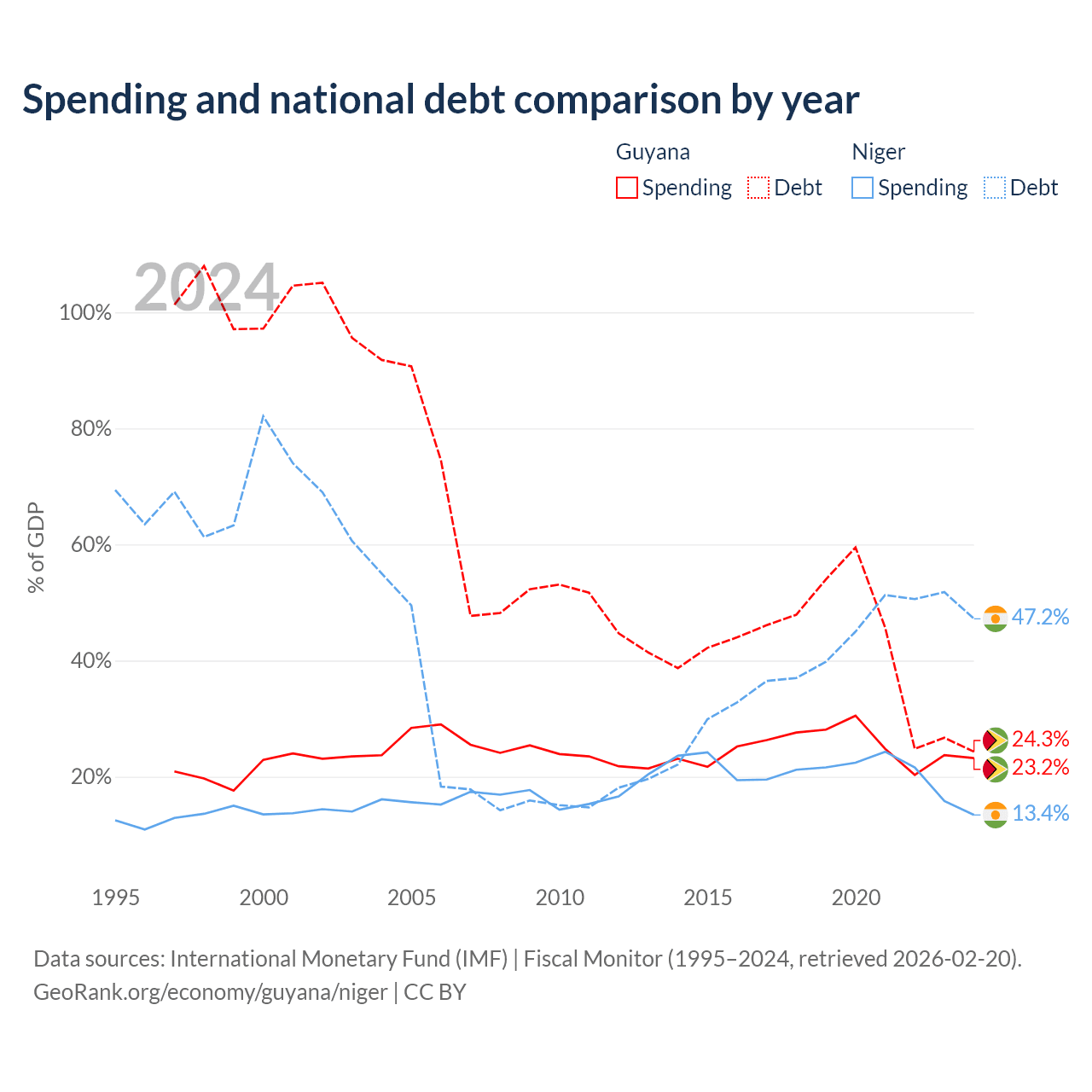 Guyana has $5.99B in government debt (24.3% of GDP), compared to $9.39B (47.2% of GDP) in Niger.