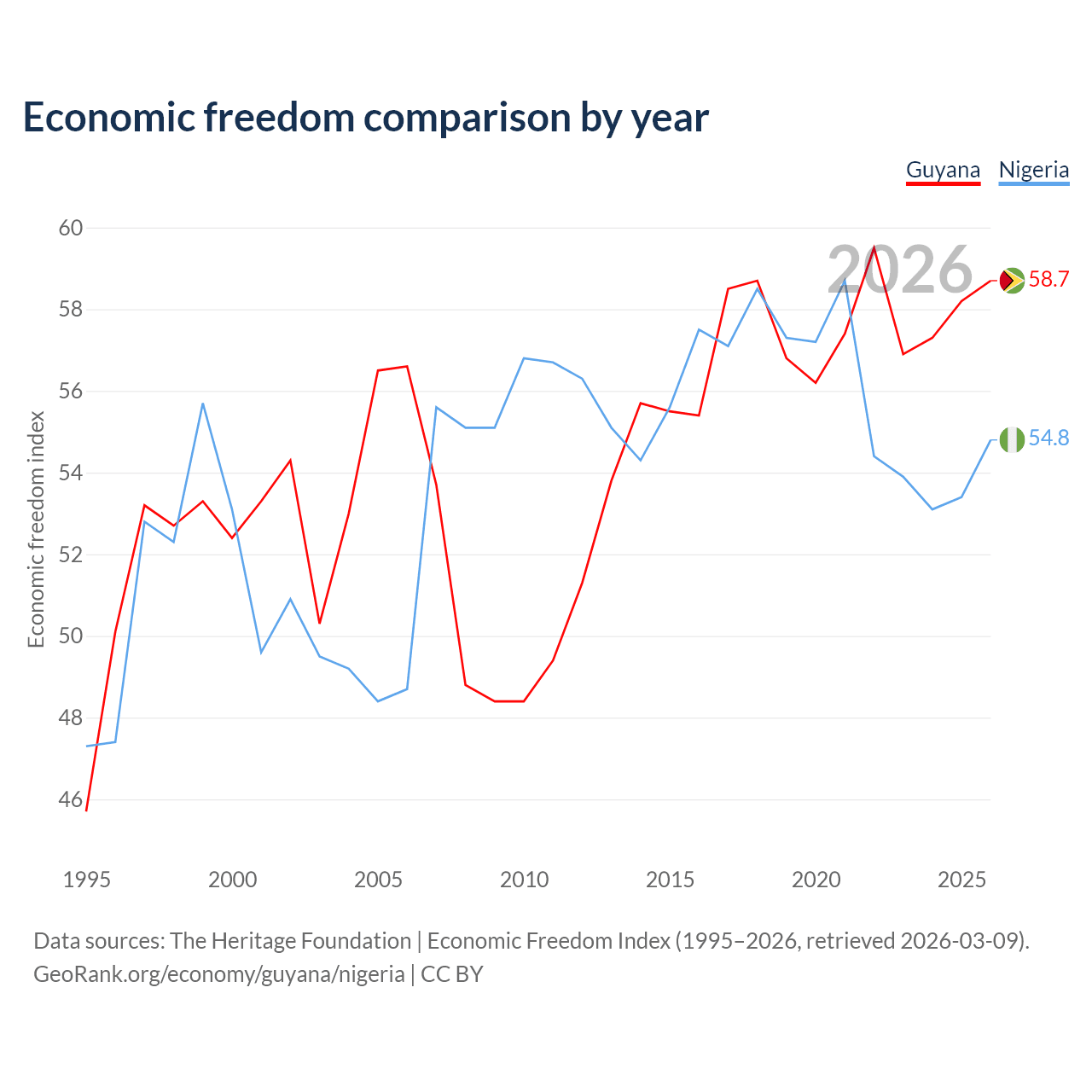 The Economic Freedom Index for Guyana is 58.7, ranking 109/197, compared to 54.8 for Nigeria, ranking 132/197. The chart above displays a comparison of annual changes in economic freedom indexes.