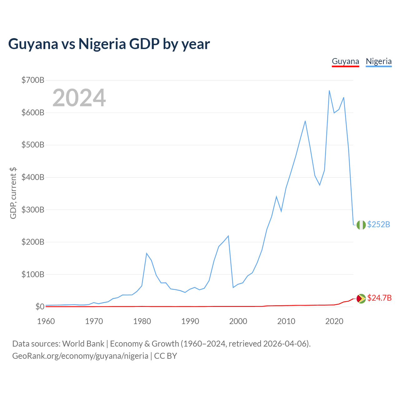 Guyana has a GDP of $24.7B compared to $252B for Nigeria, ranking 120/197 and 54/197 by economy size, respectively.