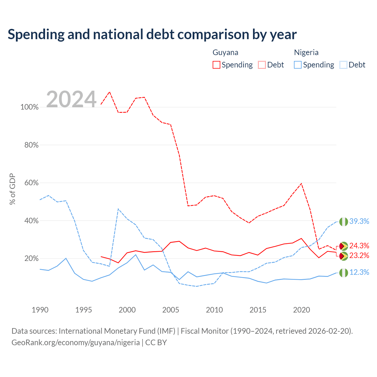 Guyana has $5.99B in government debt (24.3% of GDP), compared to $99.2B (39.3% of GDP) in Nigeria.