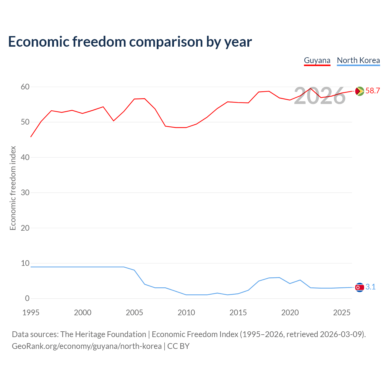 The Economic Freedom Index for Guyana is 58.7, ranking 109/197, compared to 3.1 for North Korea, ranking 197/197. The chart above displays a comparison of annual changes in economic freedom indexes.