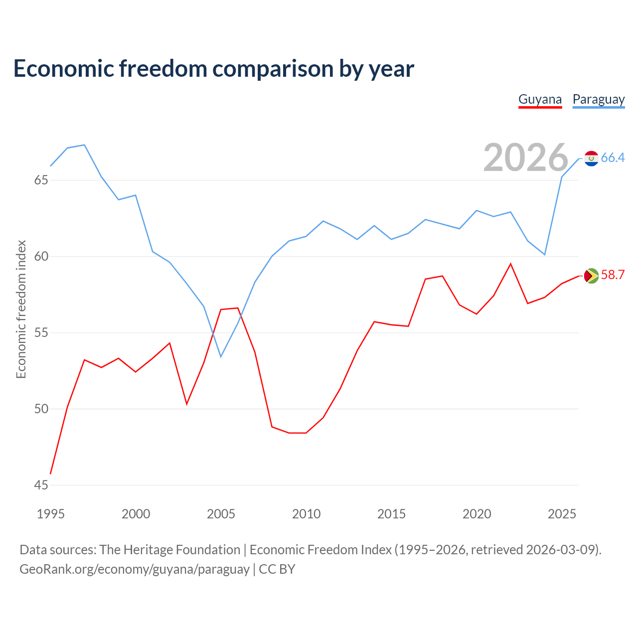 The Economic Freedom Index for Guyana is 58.7, ranking 109/197, compared to 66.4 for Paraguay, ranking 61/197. The chart above displays a comparison of annual changes in economic freedom indexes.