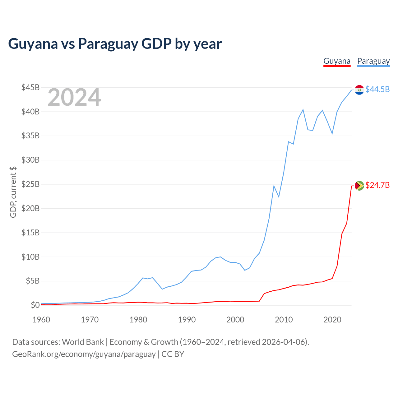 Guyana has a GDP of $24.7B compared to $44.5B for Paraguay, ranking 120/197 and 98/197 by economy size, respectively.