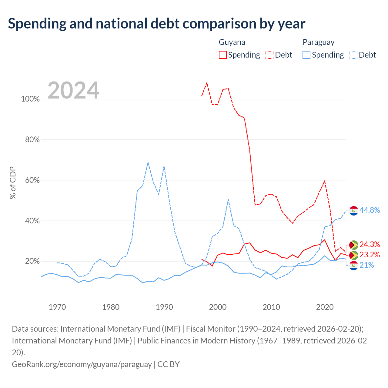 Guyana has $5.99B in government debt (24.3% of GDP), compared to $19.9B (44.8% of GDP) in Paraguay.