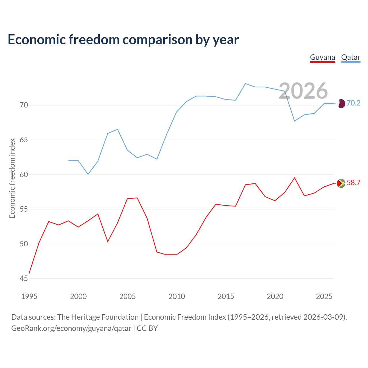 The Economic Freedom Index for Guyana is 58.7, ranking 109/197, compared to 70.2 for Qatar, ranking 37/197. The chart above displays a comparison of annual changes in economic freedom indexes.