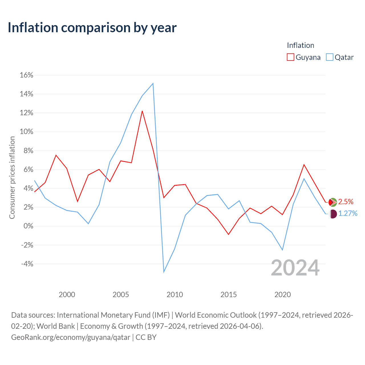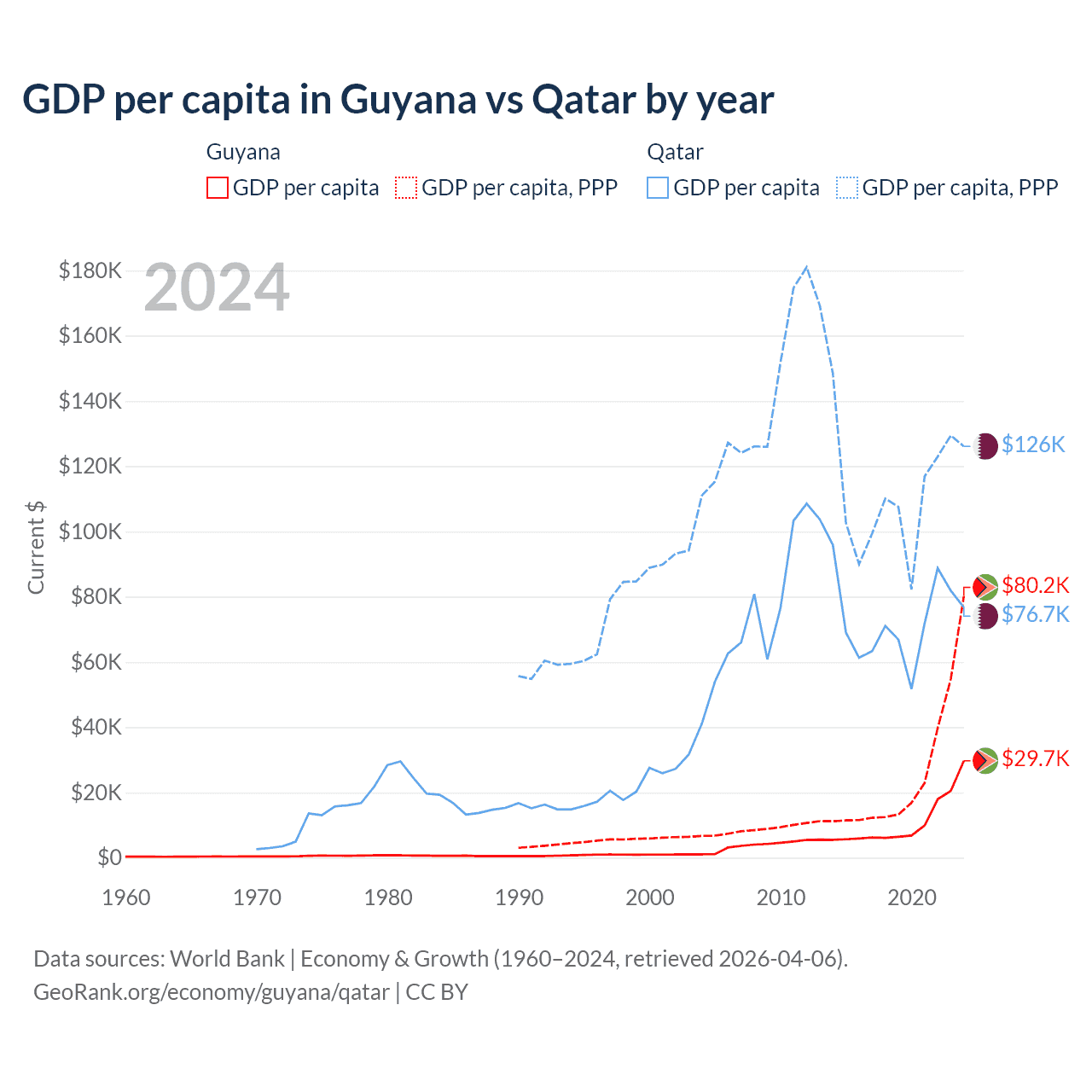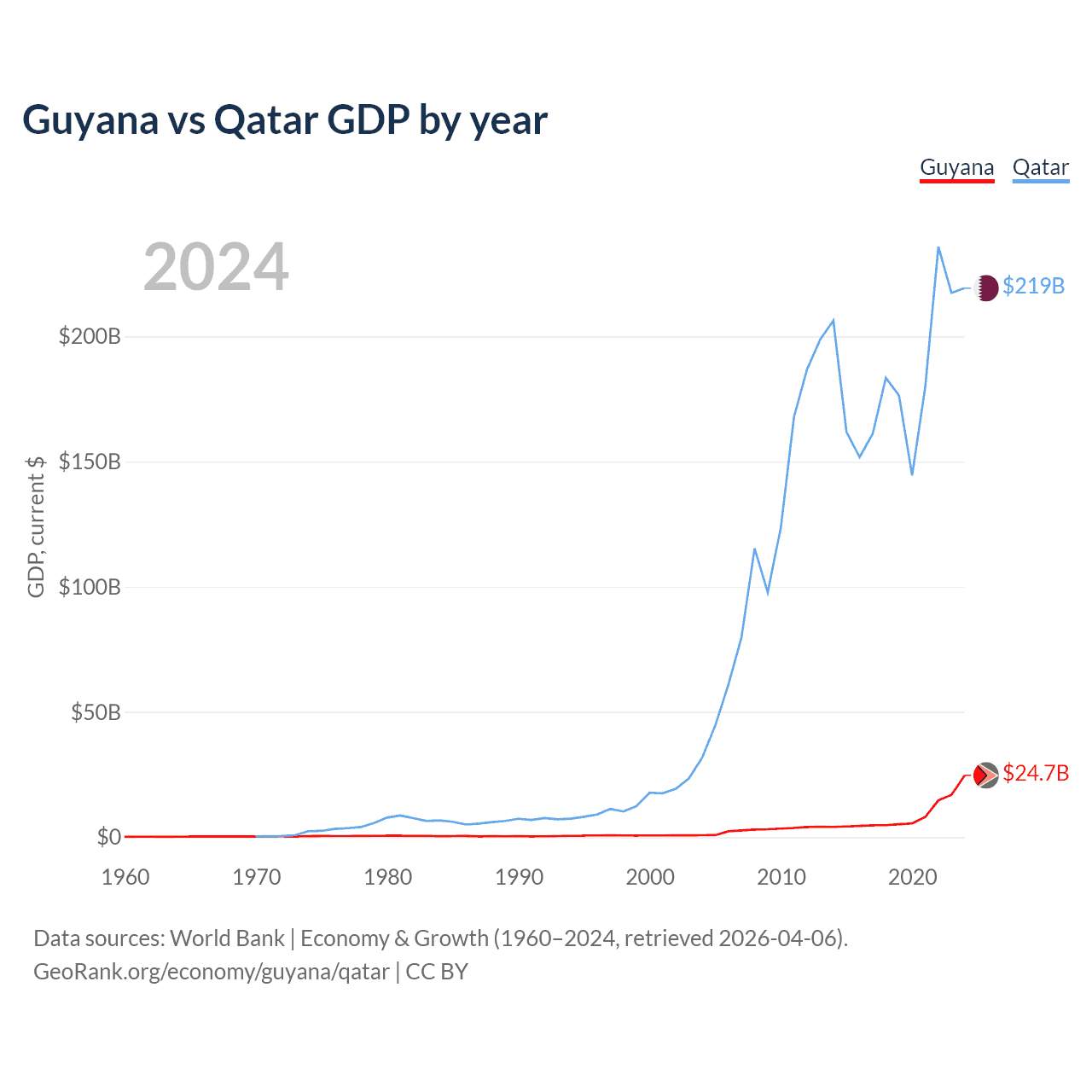 Guyana has a GDP of $24.7B compared to $219B for Qatar, ranking 120/197 and 56/197 by economy size, respectively.