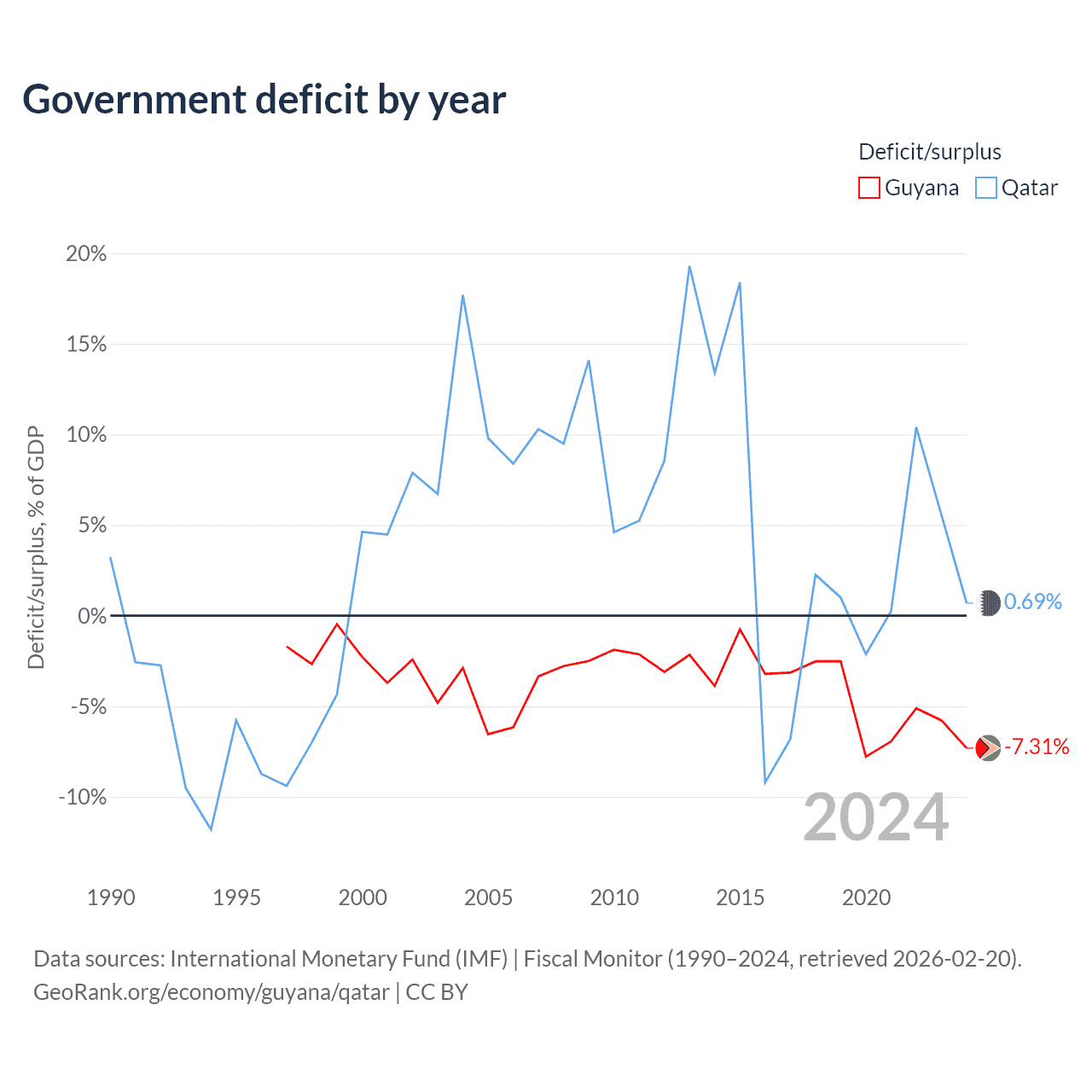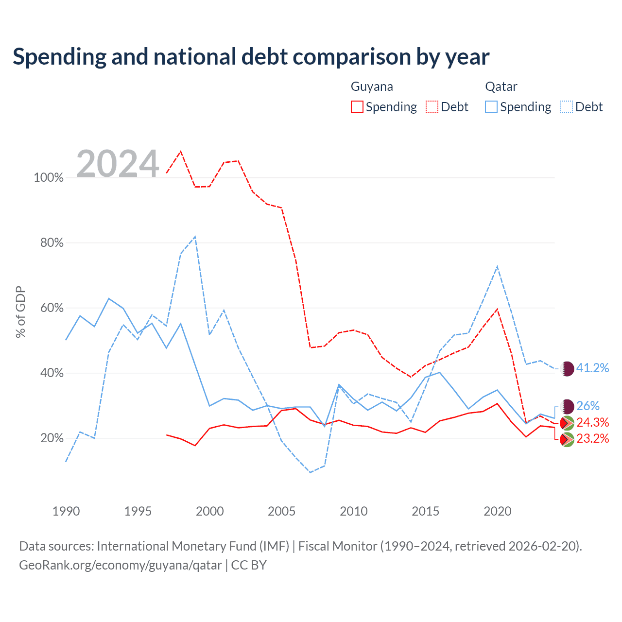 Guyana has $5.99B in government debt (24.3% of GDP), compared to $90.2B (41.2% of GDP) in Qatar.