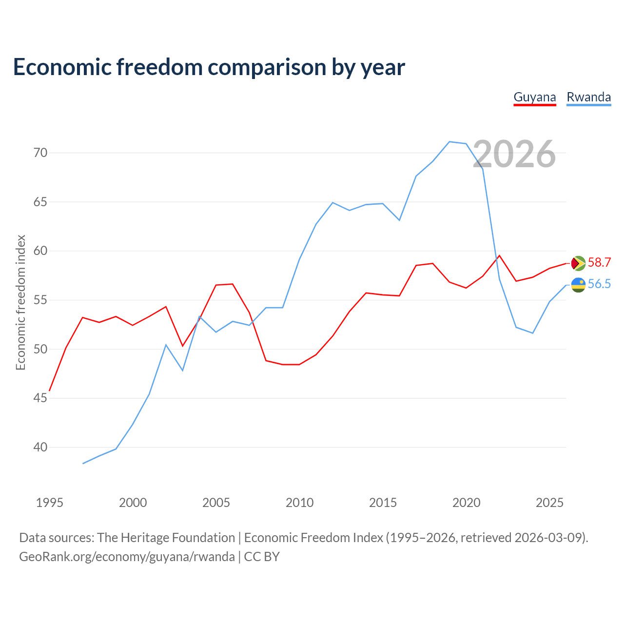 The Economic Freedom Index for Guyana is 58.7, ranking 109/197, compared to 56.5 for Rwanda, ranking 121/197. The chart above displays a comparison of annual changes in economic freedom indexes.
