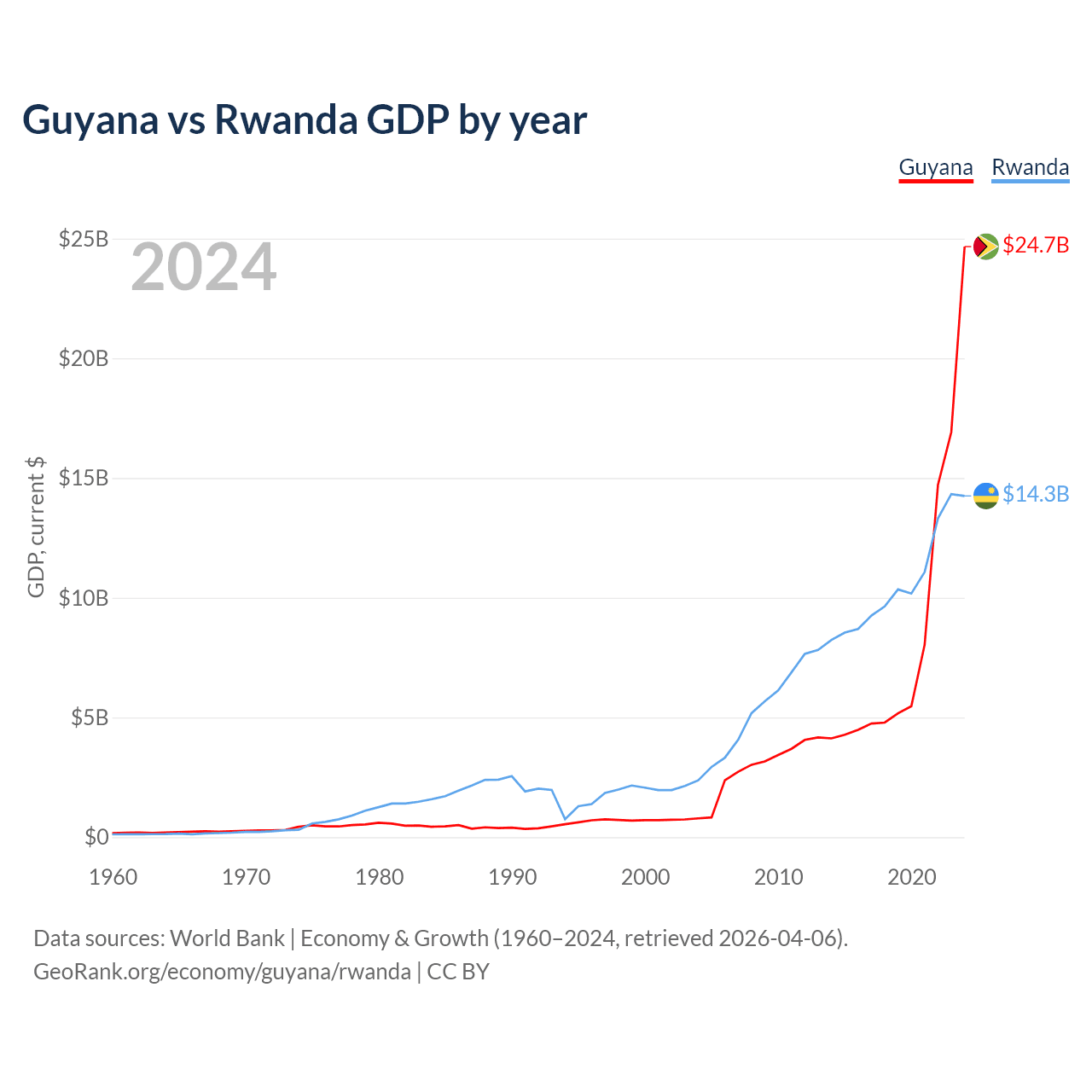 Guyana has a GDP of $24.7B compared to $14.3B for Rwanda, ranking 120/197 and 144/197 by economy size, respectively.