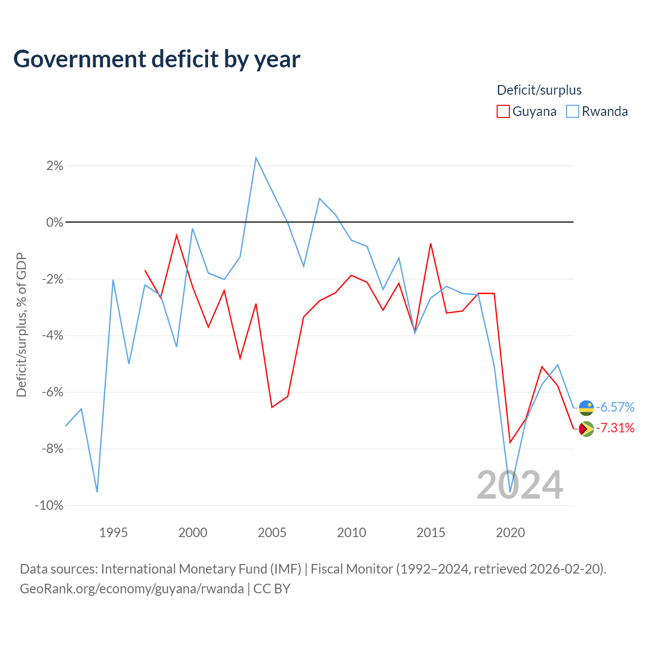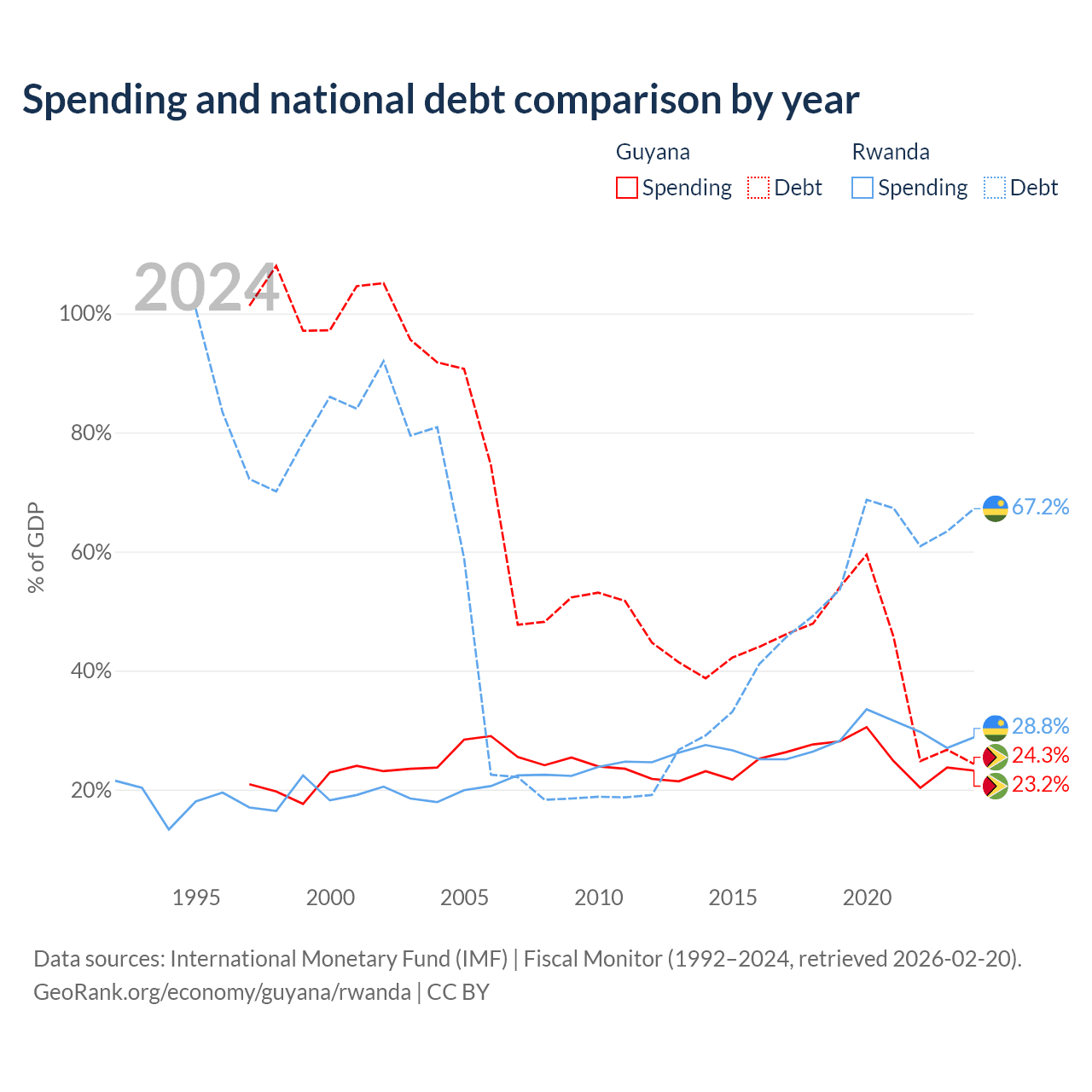 Guyana has $5.99B in government debt (24.3% of GDP), compared to $9.58B (67.2% of GDP) in Rwanda.