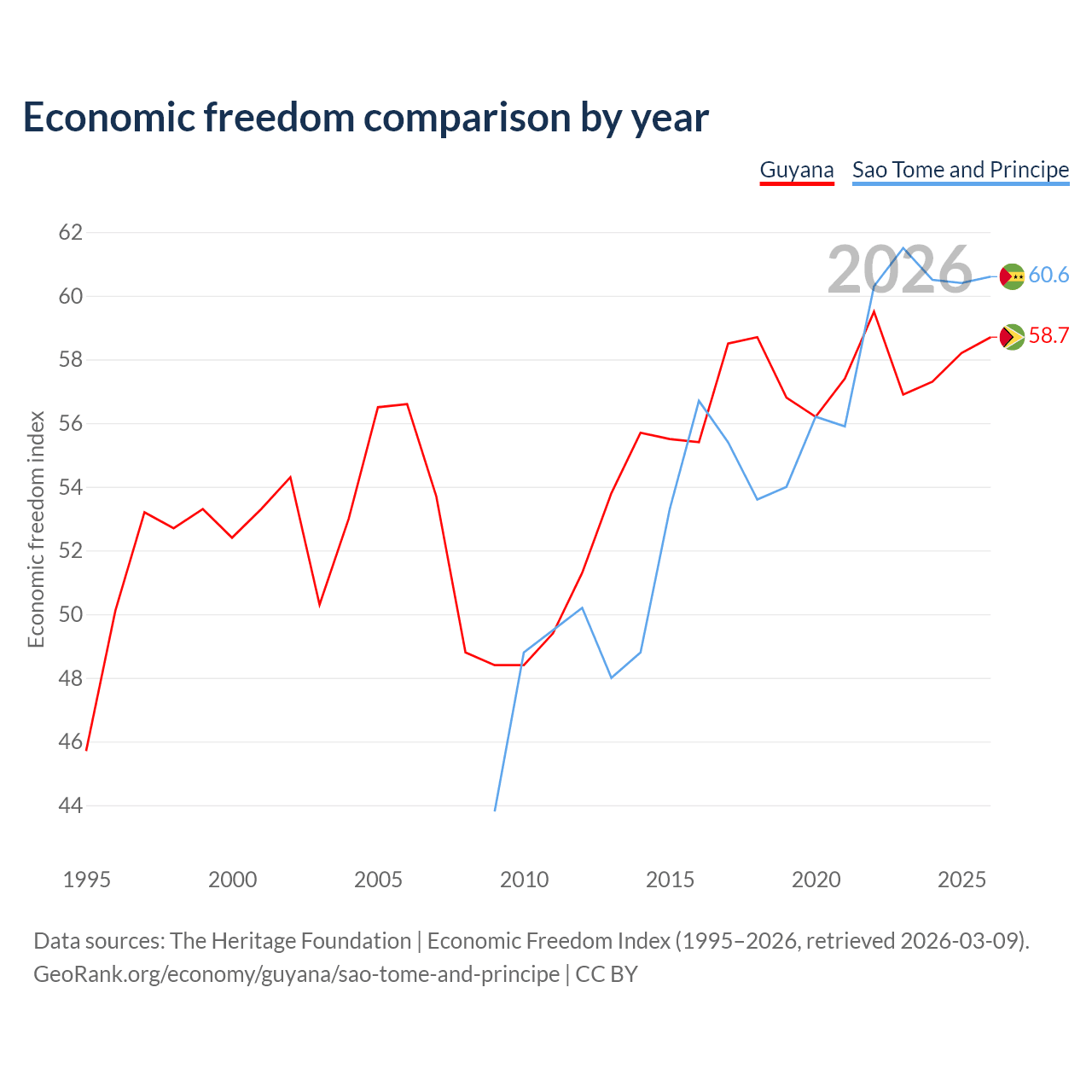 The Economic Freedom Index for Guyana is 58.7, ranking 109/197, compared to 60.6 for Sao Tome and Principe, ranking 93/197. The chart above displays a comparison of annual changes in economic freedom indexes.