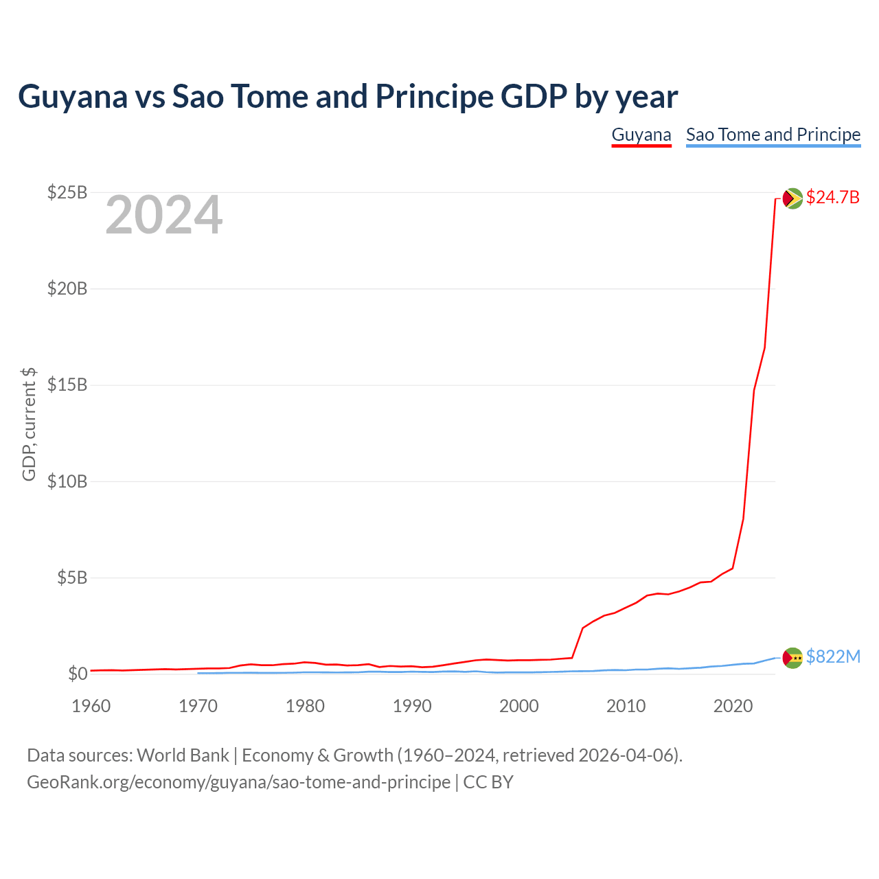 Guyana has a GDP of $24.7B compared to $822M for Sao Tome and Principe, ranking 120/197 and 189/197 by economy size, respectively.