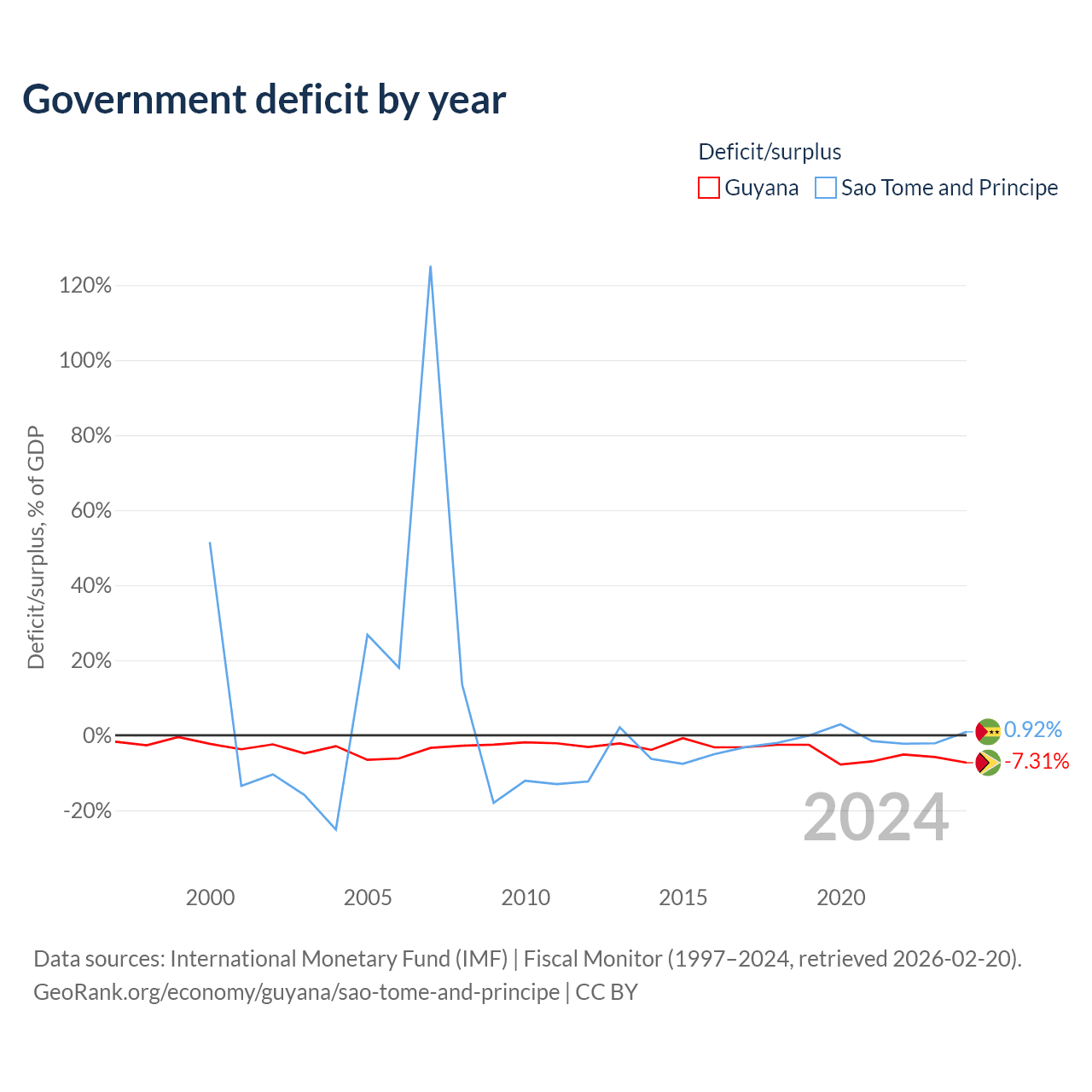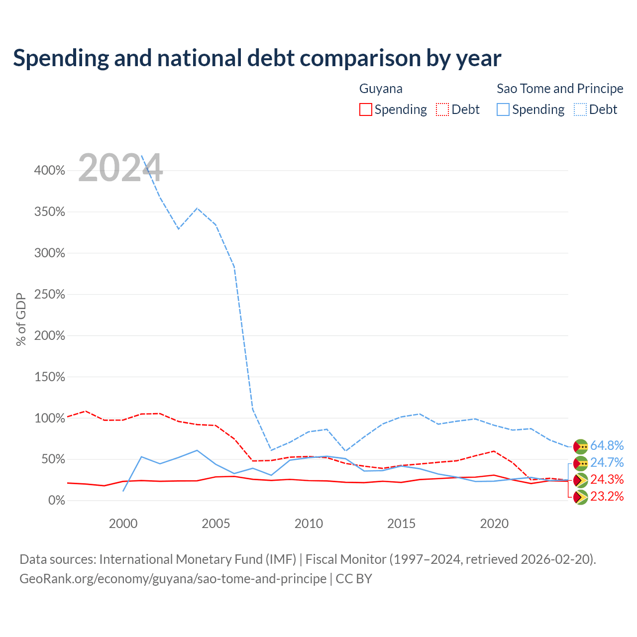 Guyana has $5.99B in government debt (24.3% of GDP), compared to $533M (64.8% of GDP) in Sao Tome and Principe.